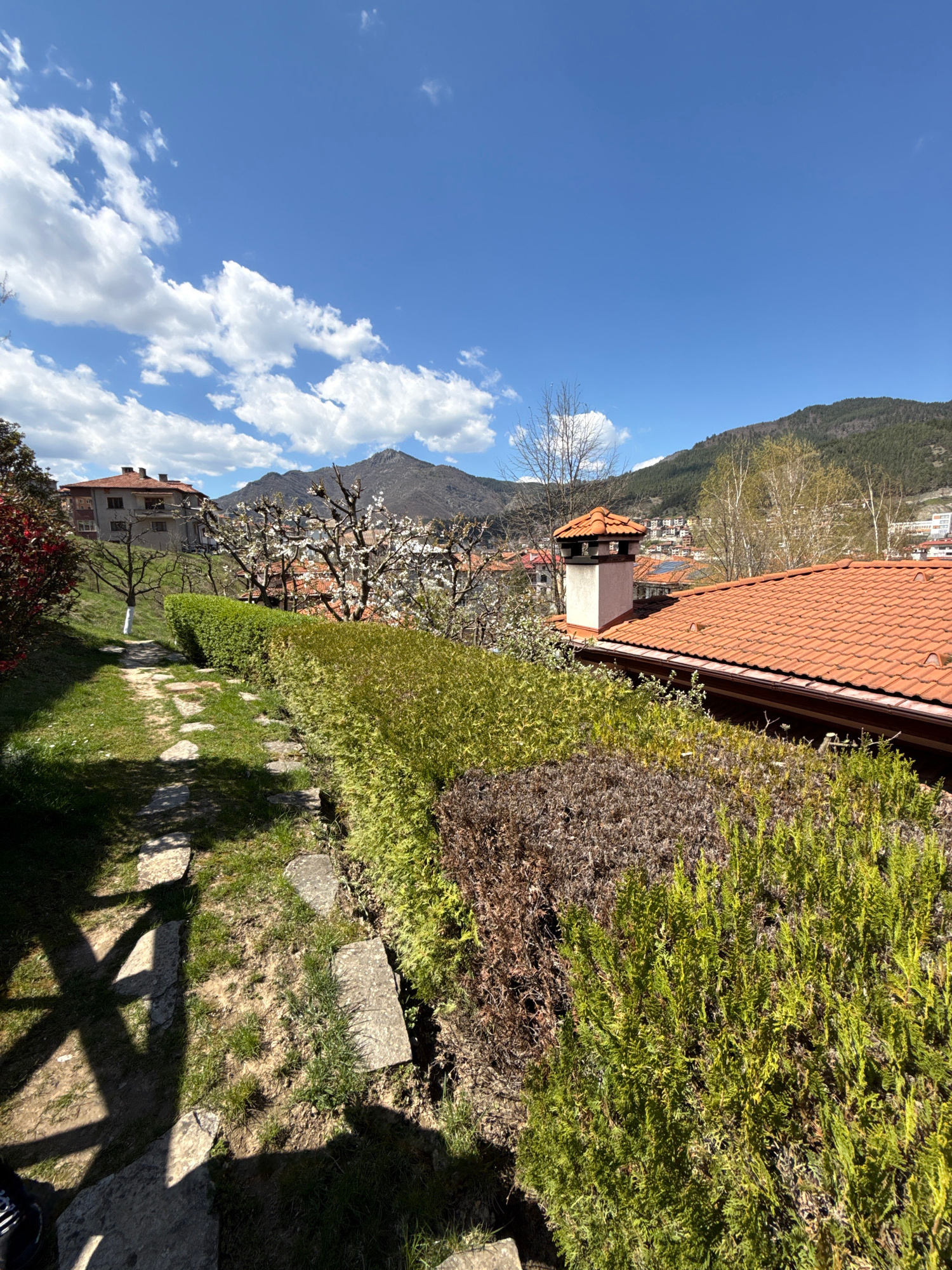 The image shows a daytime view in Devin, Bulgaria, featuring a path made of irregularly placed stones cutting through a green lawn. A lush green hedge borders the path on one side, transitioning into…read more