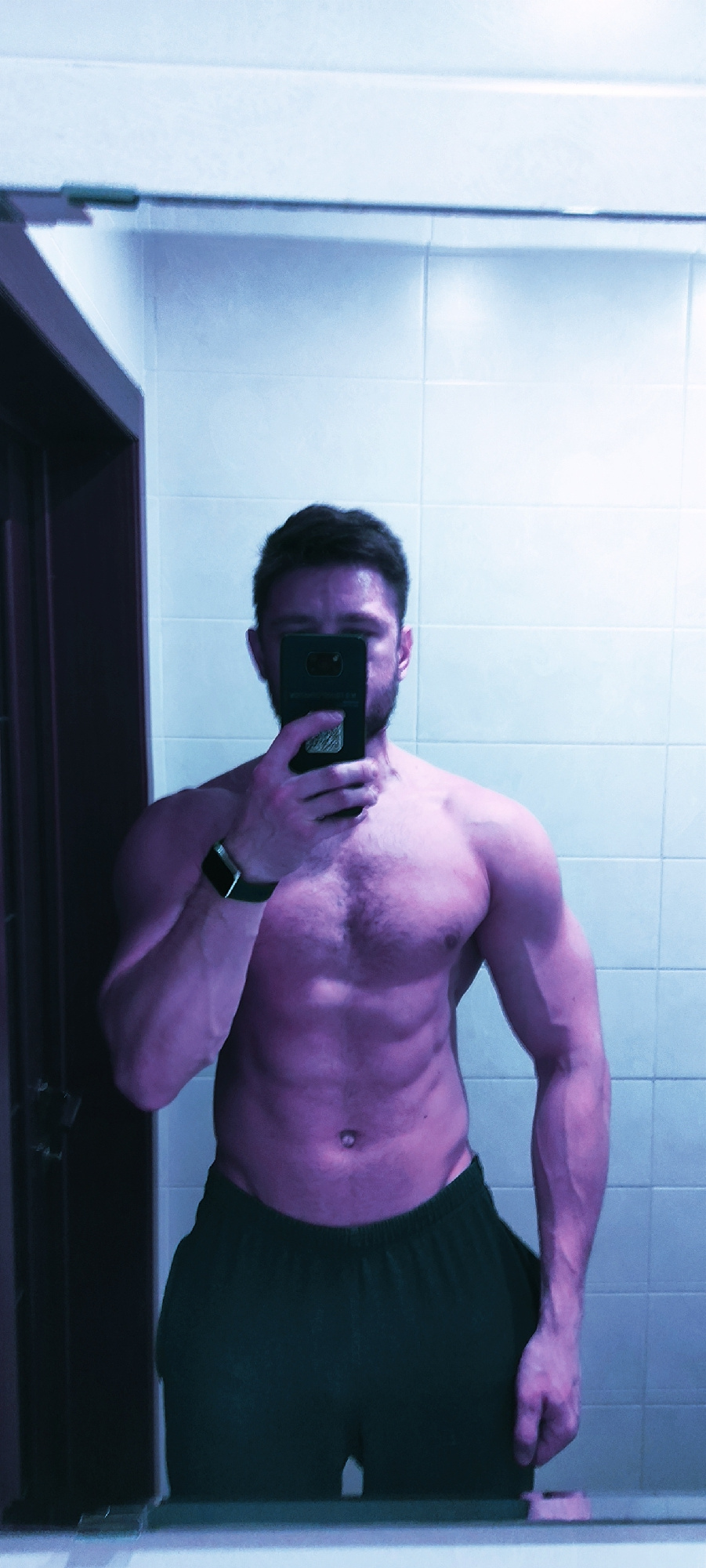 A man takes a mirror selfie in a bathroom. The bathroom has white tiled walls. The man is shirtless, wearing dark shorts, and holding a smartphone. He is wearing a smartwatch on his left wrist. The sc…read more