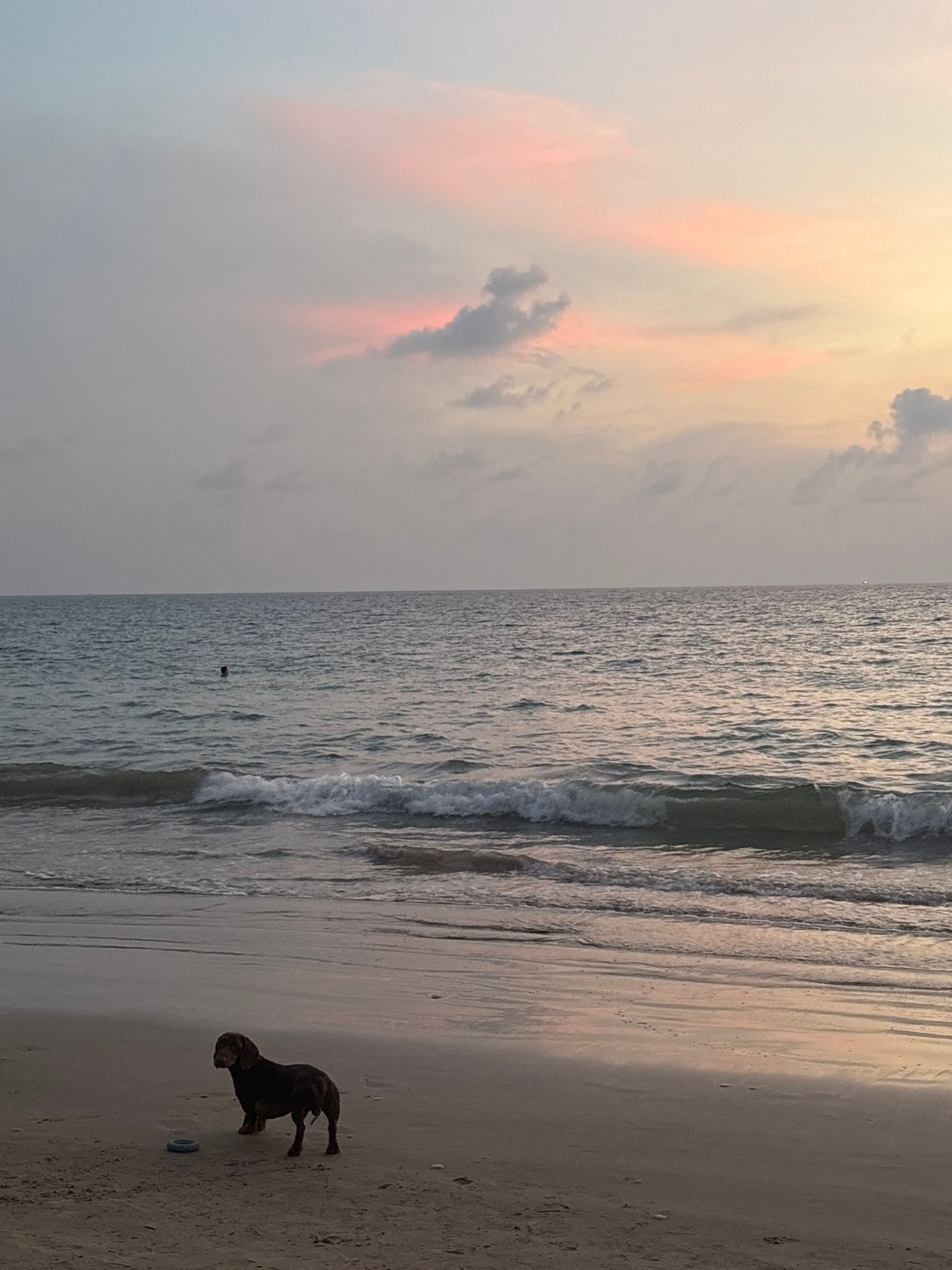 This image captures a tranquil beach scene at either sunrise or sunset, characterized by soft, diffused lighting. The sky, occupying the upper portion of the frame, displays delicate pastel shades of…read more
