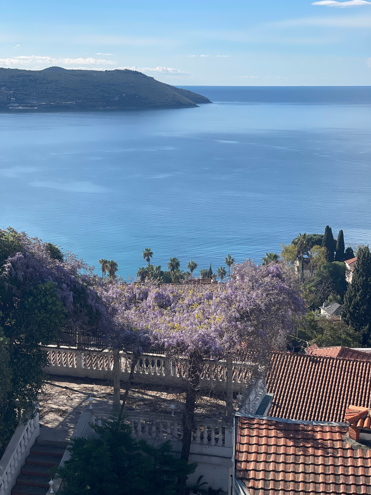Captured from an elevated vantage point, the photograph depicts a coastal scene in Herceg Novi, Montenegro. In the foreground are rooftops with terracotta tiles and a lush tree with purple blossoms in…read more