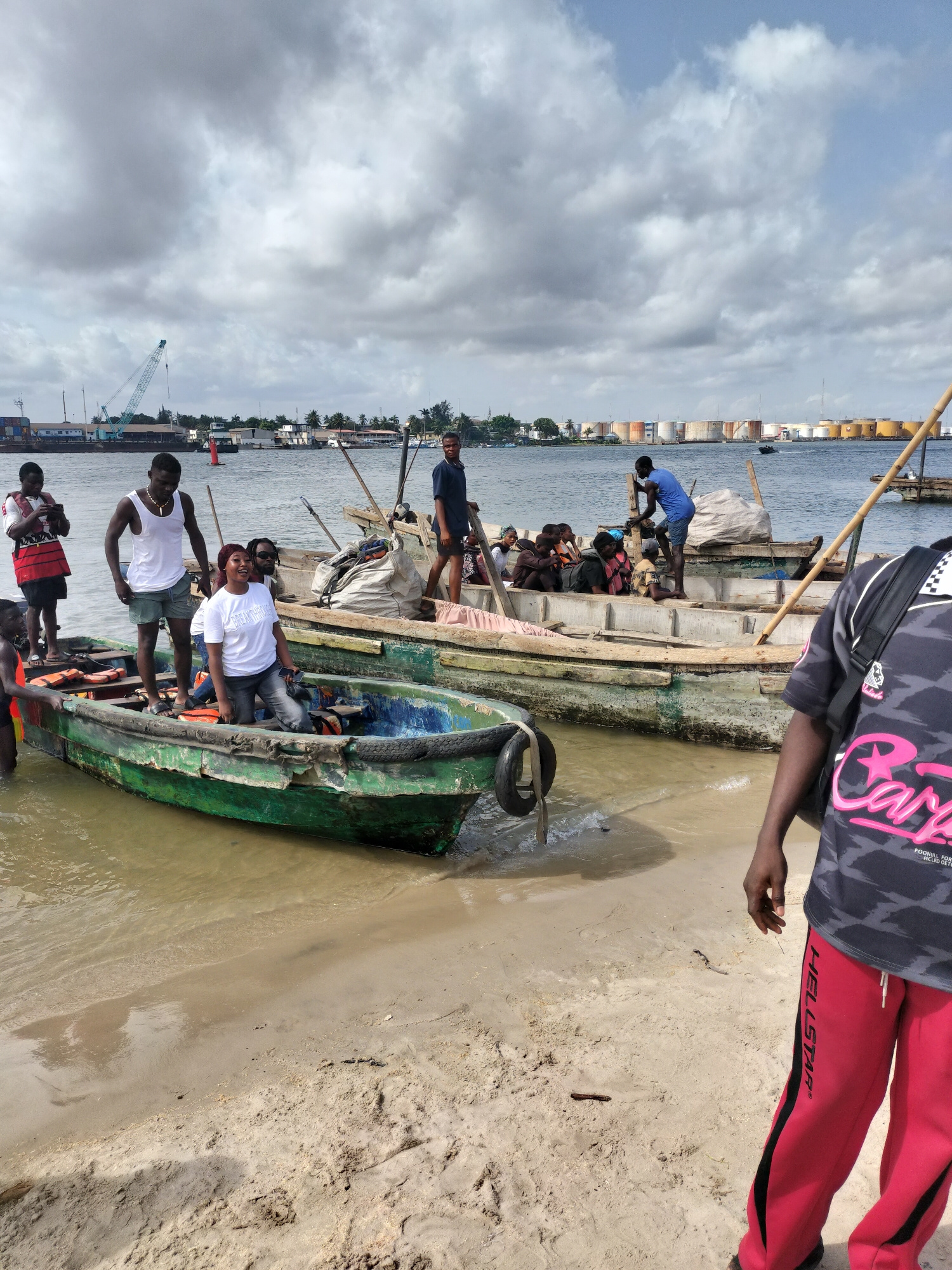 The scene captures a gathering of people around two small boats on a beach, potentially within the Lagos, Nigeria area due to the presence of multiple storage tanks or large industrial containers visi…read more