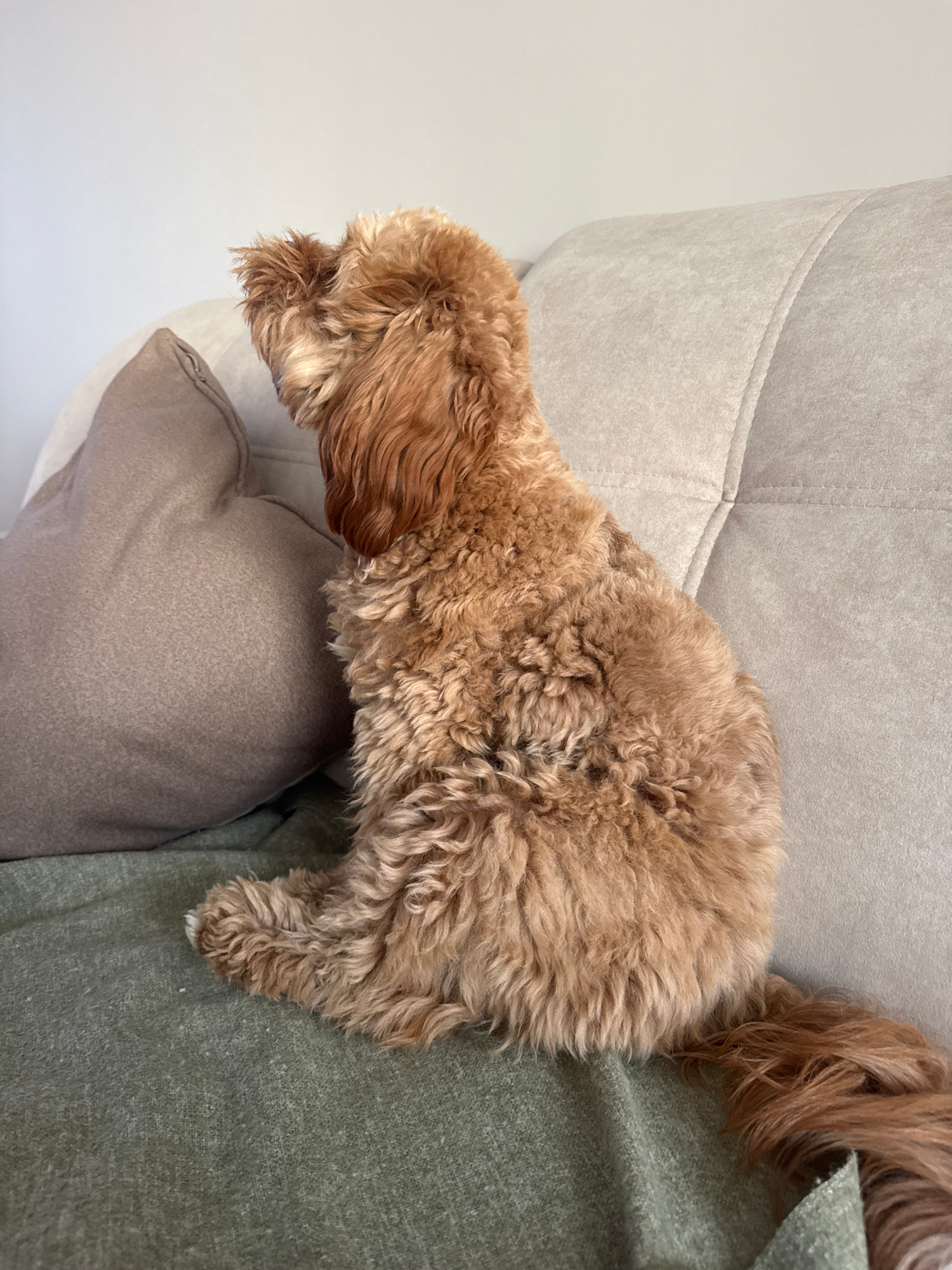 A small, brown, curly-haired dog is perched on a beige and grey cushion atop a beige chair or couch. The dog appears to be resting its head on the cushion. Part of a green blanket or garment is also v…read more