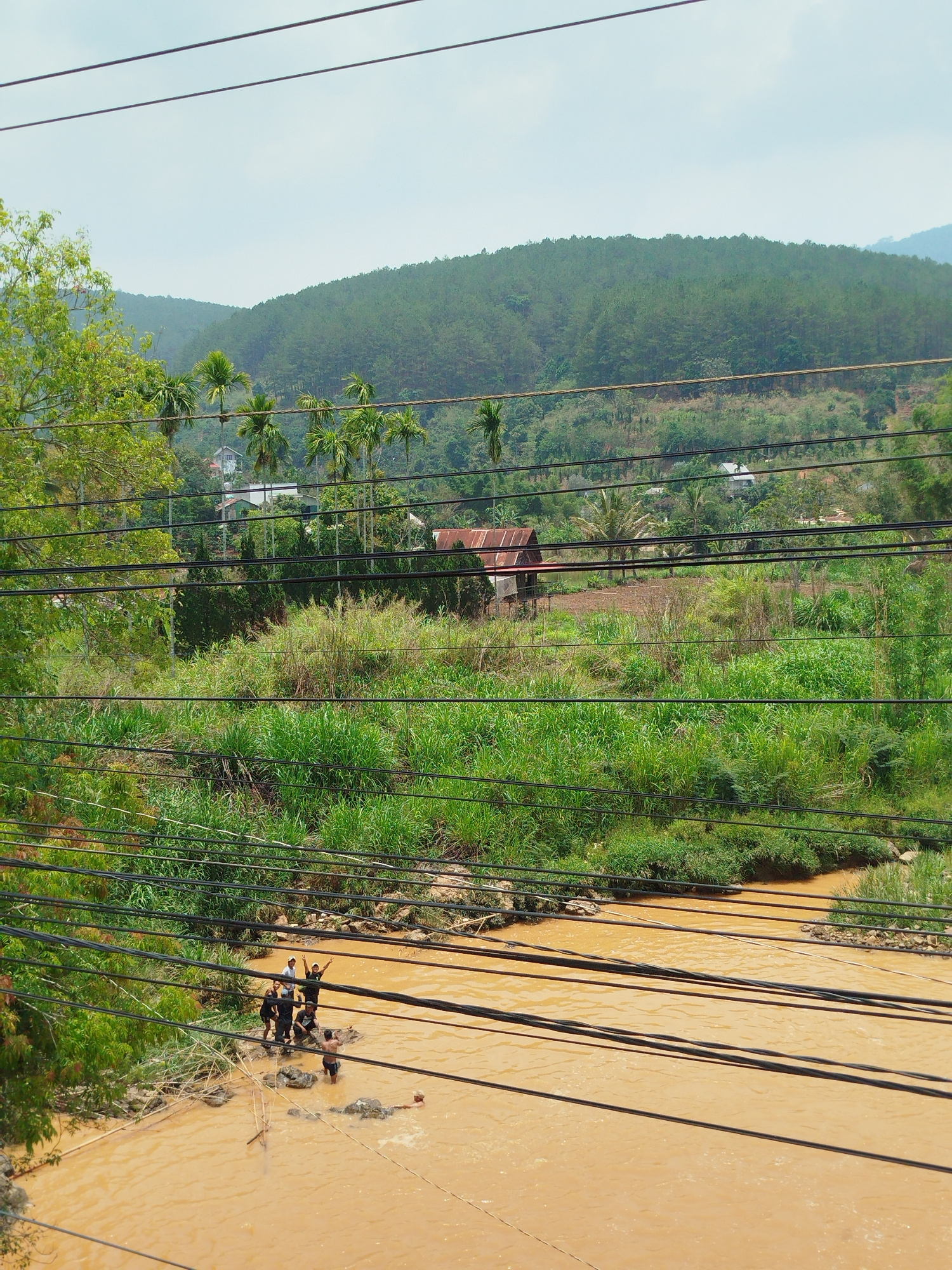 The image presents an obstructed view of a rural landscape in Thôn 3, Vietnam, characterized by lush vegetation, forested hills, and a wide, muddy river. Numerous black electrical or communication cab…read more