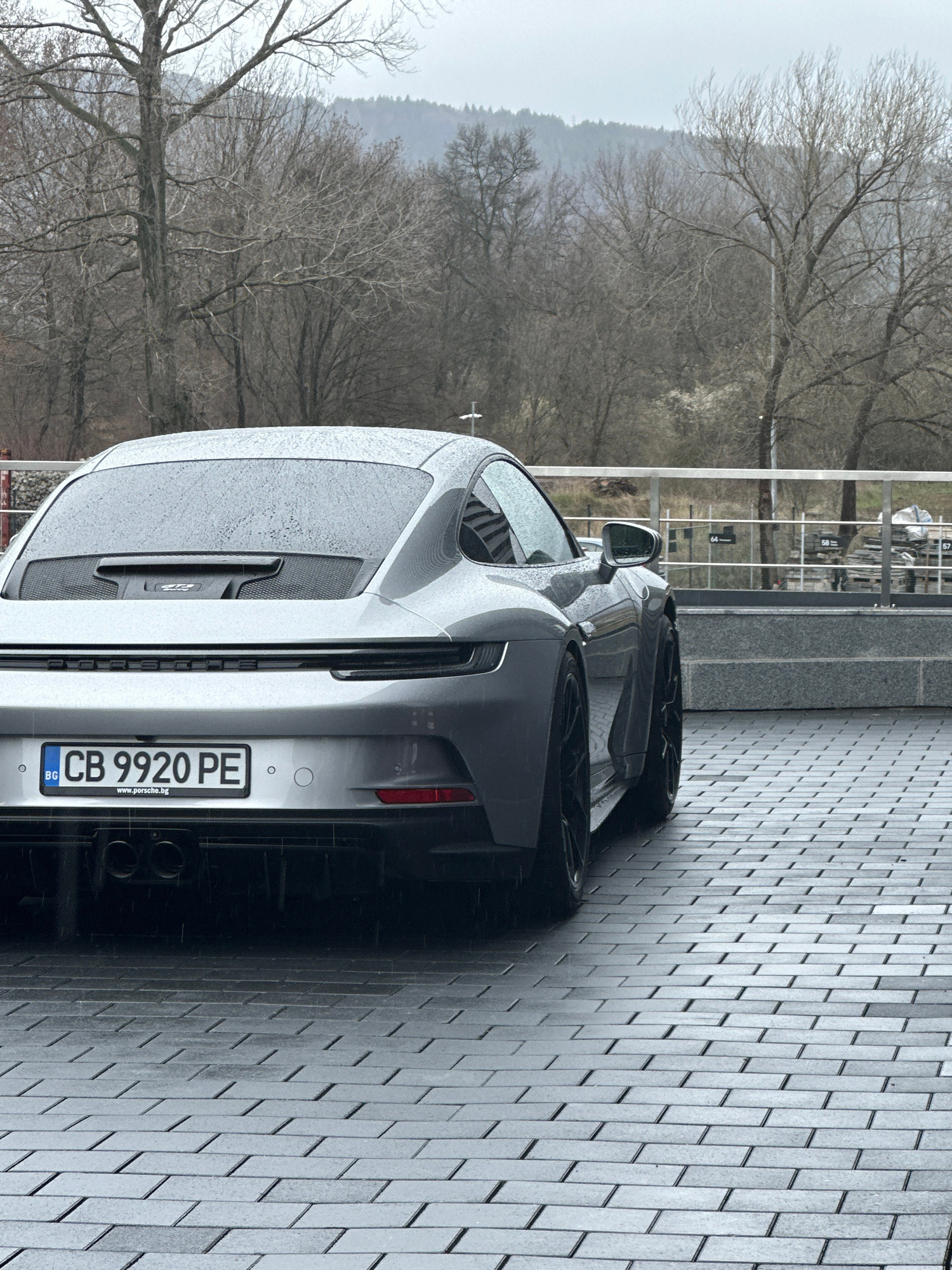 A wet, gray Porsche 911 GT3 with Bulgarian license plate "CB 9920 PE" is parked on a brick-paved surface. The car's rear is toward the viewer. The license plate includes the website "www.porsche.bg."…read more