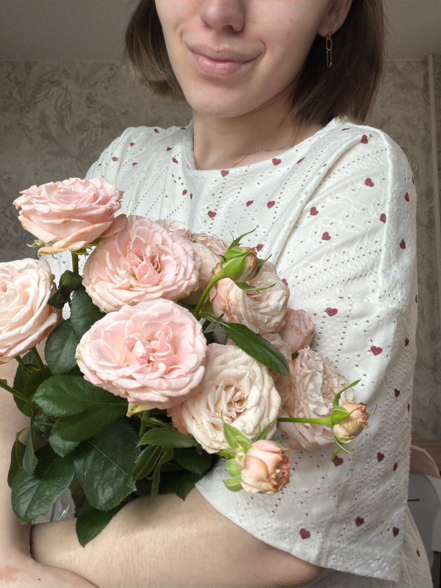 A woman holds a bouquet of pale pink roses with green foliage. She is wearing a white blouse with small red hearts. She is smiling slightly and wearing a gold chain necklace and a gold earring. The ba…read more
