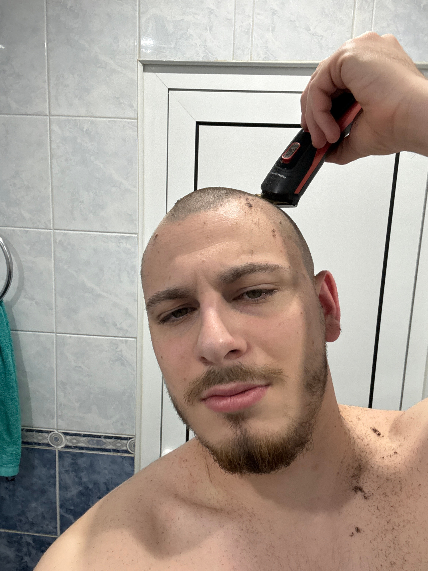 A man is in a bathroom, shaving his head with an electric razor. The bathroom has light blue and white tiled walls and a white-framed window. A rolled-up green towel is visible at the bottom of the im…read more