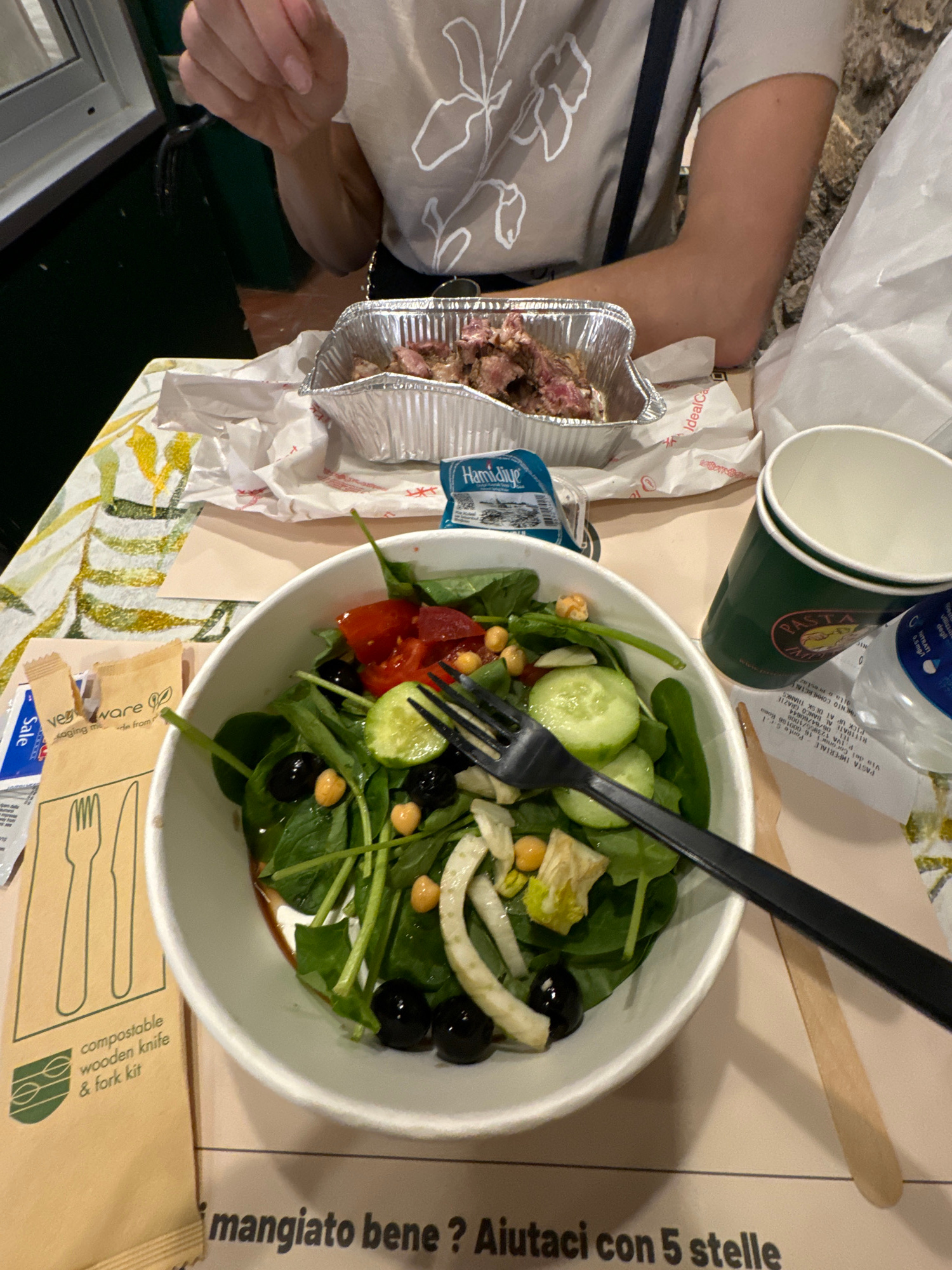 A partially visible person is seated at a table with a variety of food items. The person is wearing a light-colored shirt with a floral pattern on the sleeve. On the table, there's a white bowl filled…read more