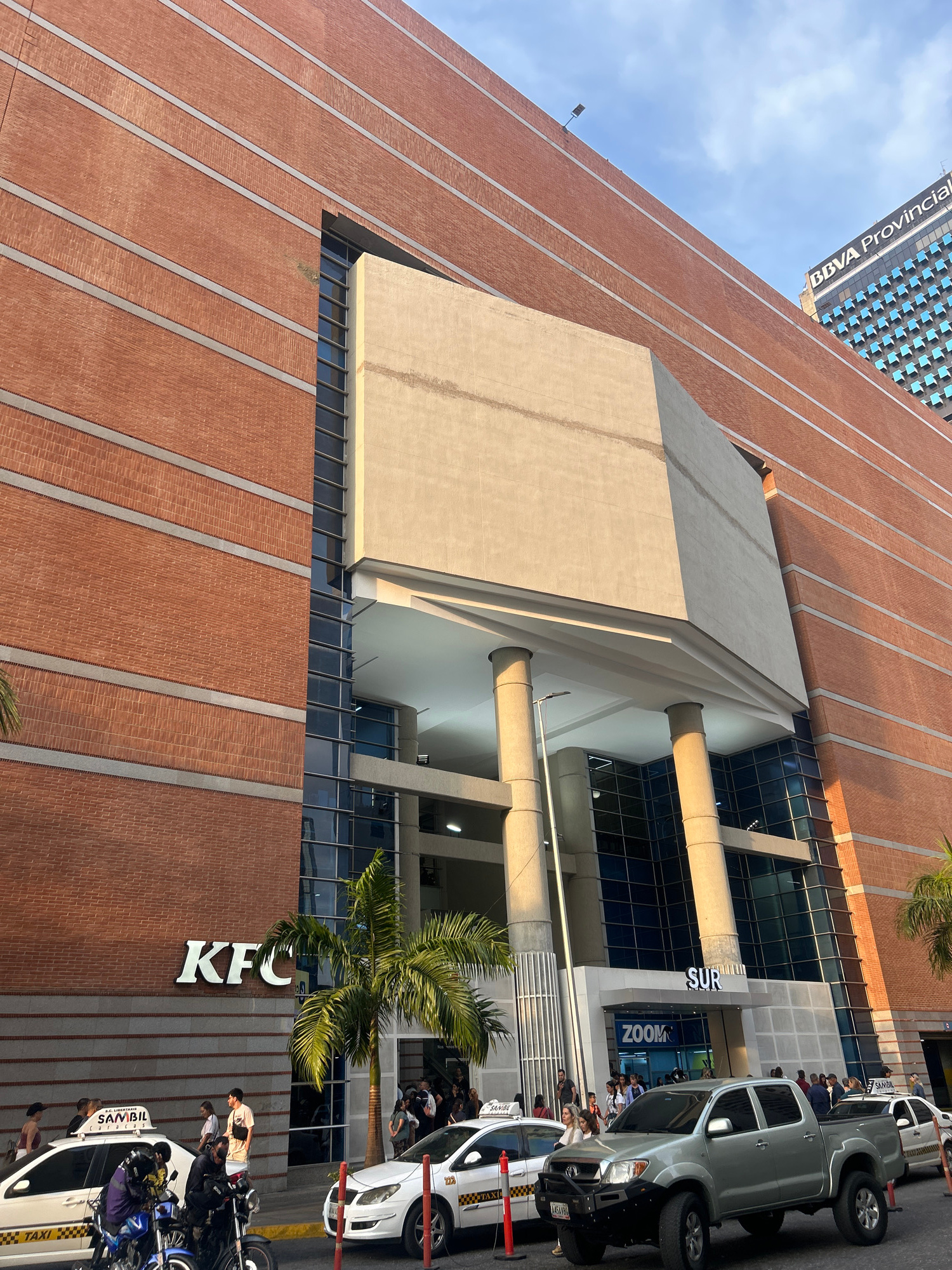The image shows a low-angle shot of a multi-story brick building in Caracas, Venezuela. In the foreground, there is a KFC restaurant with a sign in white letters on the building. Next to it there is a…read more