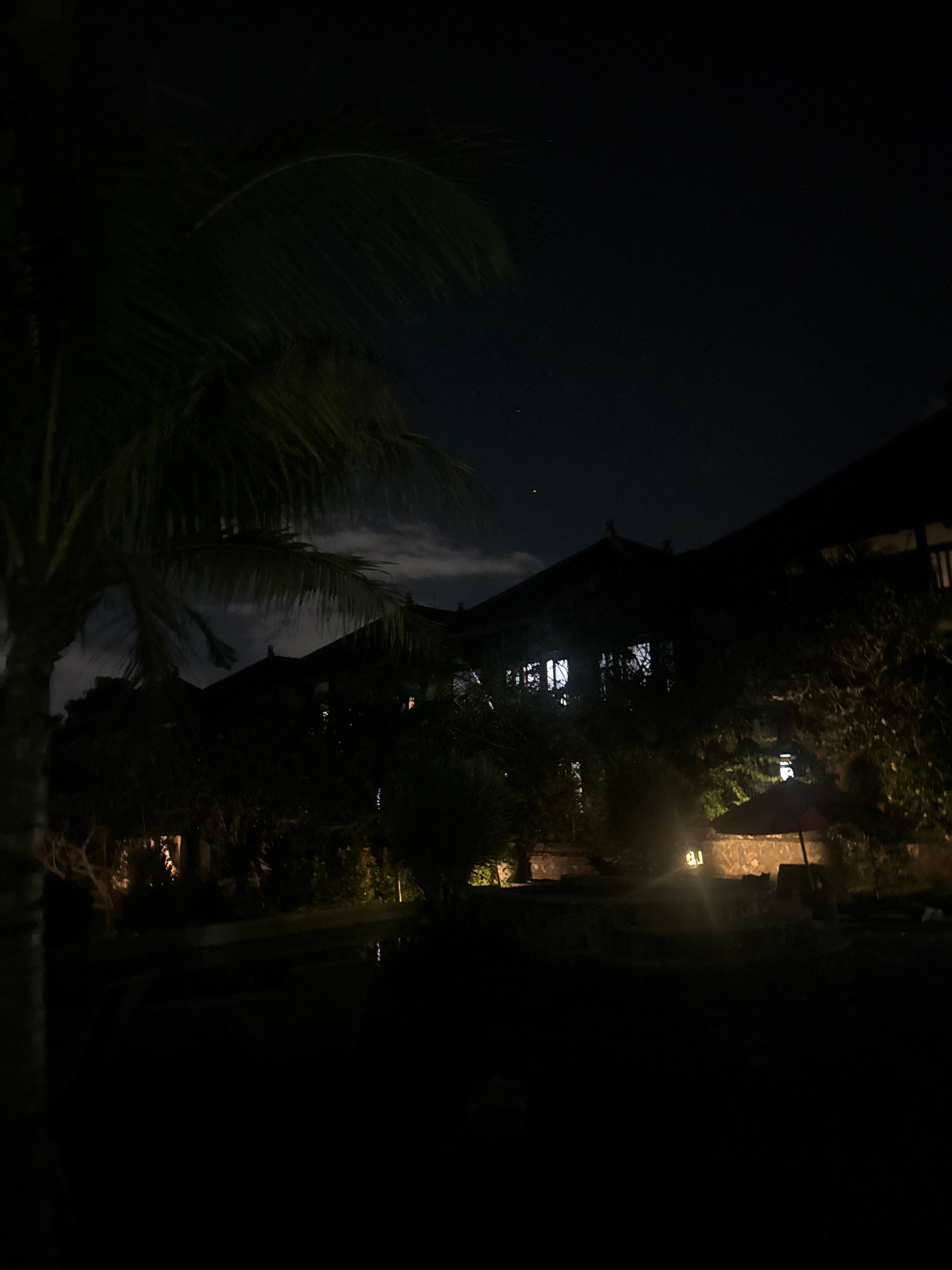 The image, possibly taken at night in Ungasan, Indonesia, shows a dark scene with a blend of natural and artificial elements. A palm tree is silhouetted against the dark sky, and a building with lit w…read more