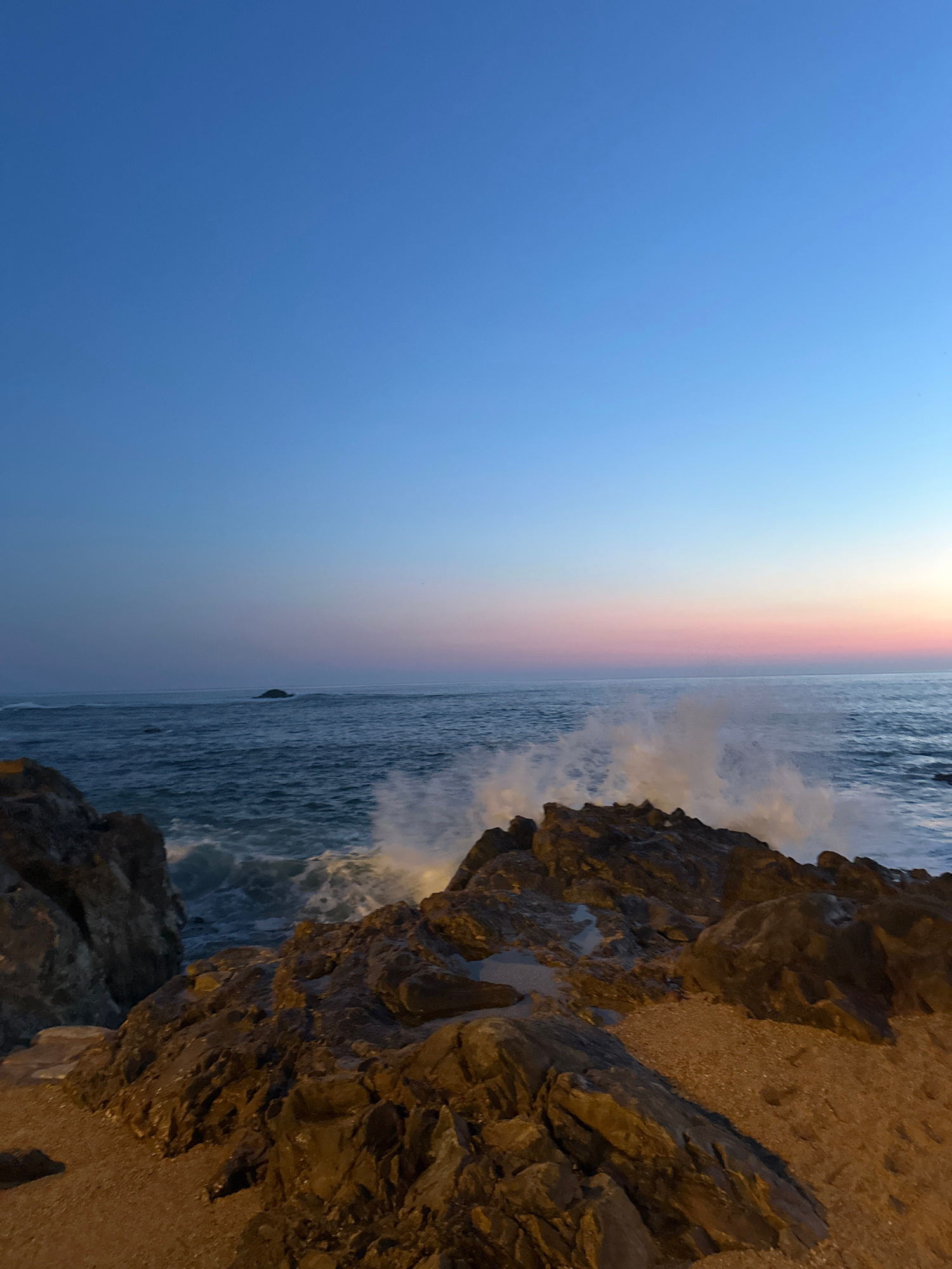 The image displays a coastal scene at twilight along the Atlantic coast in Foz do Douro, Porto, Portugal. The sky transitions from a deep blue overhead to a lighter blue, then to soft pink and orangeβ¦read more