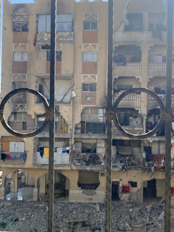 The image depicts a multi-story residential building in Khan Yunis, Palestinian Territory, viewed through rusted metal bars featuring two prominent circular elements. The building, constructed with ta…read more