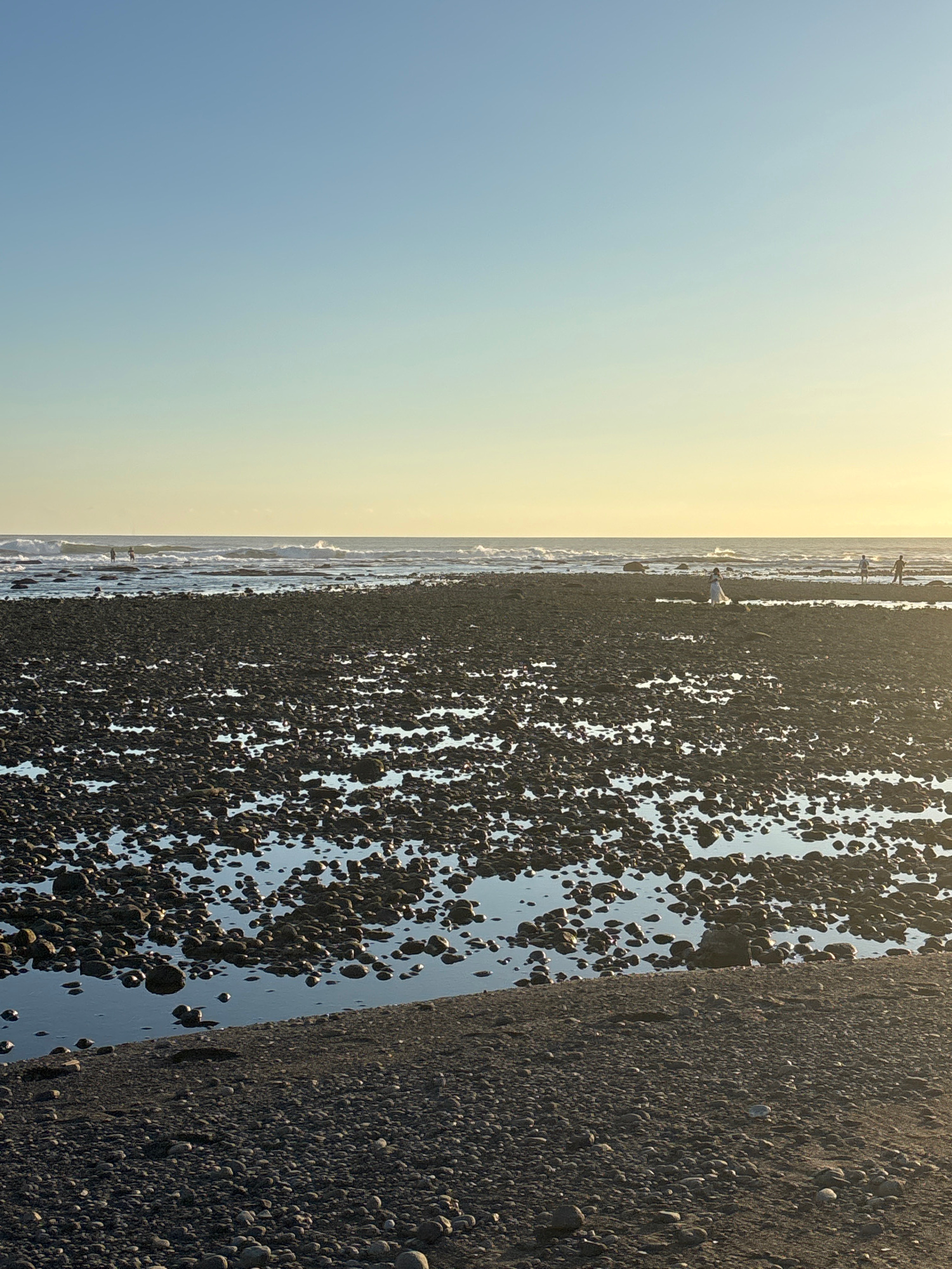This image captures a serene, expansive rocky beach scene, likely at low tide, under a broad sky during either sunrise or sunset. The sky, filling the upper portion of the frame, displays a gentle gra…read more