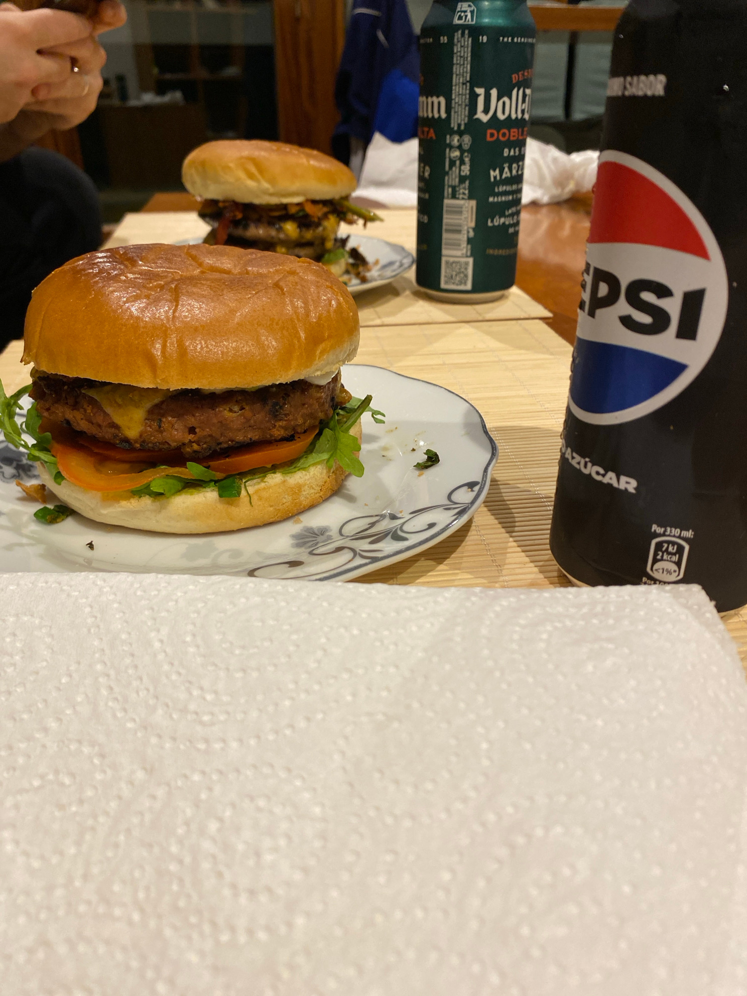 The image depicts a table setting with food and drinks. There are two burgers, one in the foreground appearing larger and featuring visible layers of ingredients like patty, tomato, lettuce, and chees…read more
