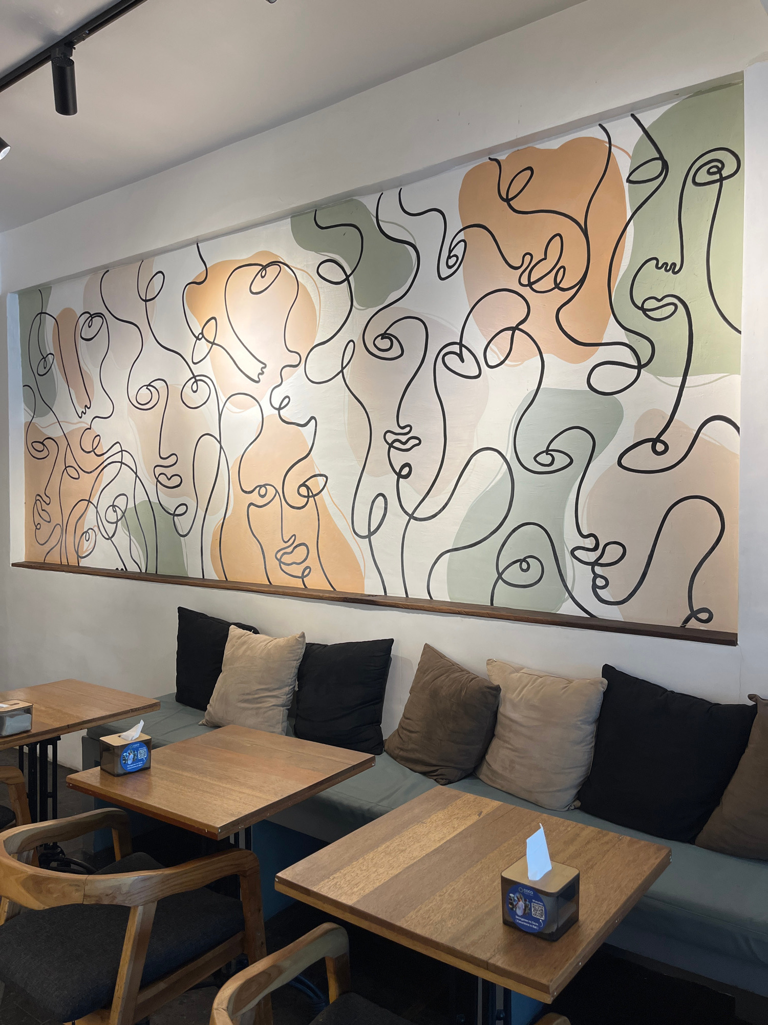 The image shows an interior space with a decorated wall, cushions, tables, and chairs, likely in a commercial setting. The wall features an abstract design of interconnected black lines over colored s…read more