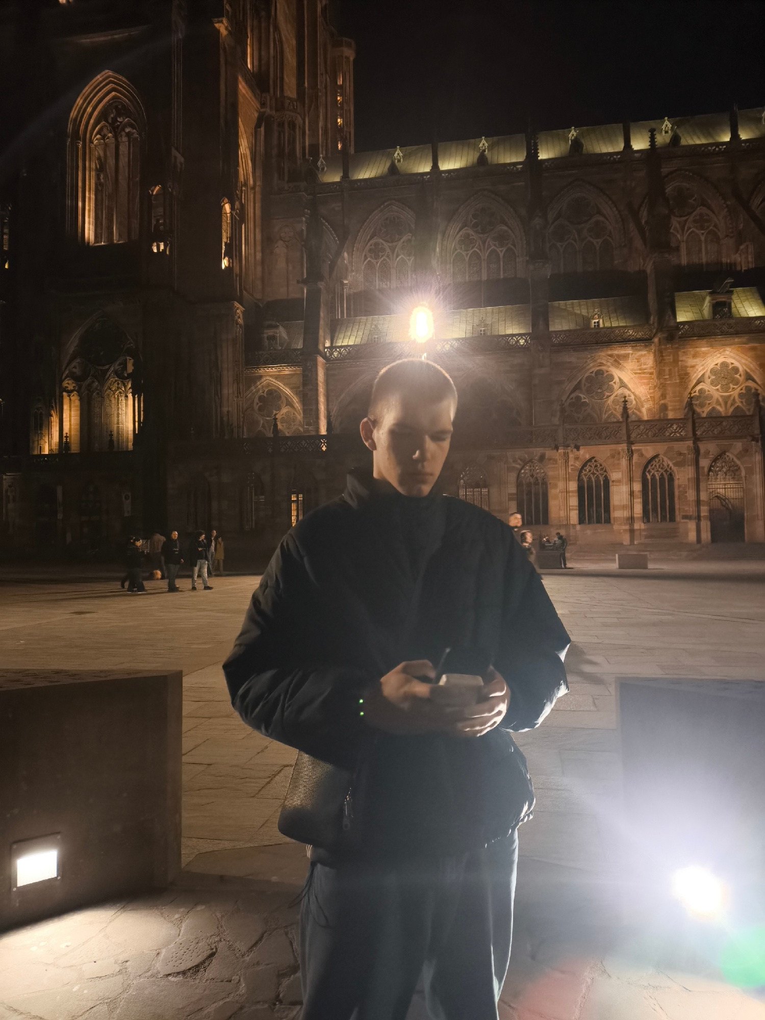 A low-angle shot at night features a male figure standing in front of Strasbourg Cathedral in Strasbourg, France. The cathedral's detailed Gothic facade forms the backdrop, illuminated with warm light…read more