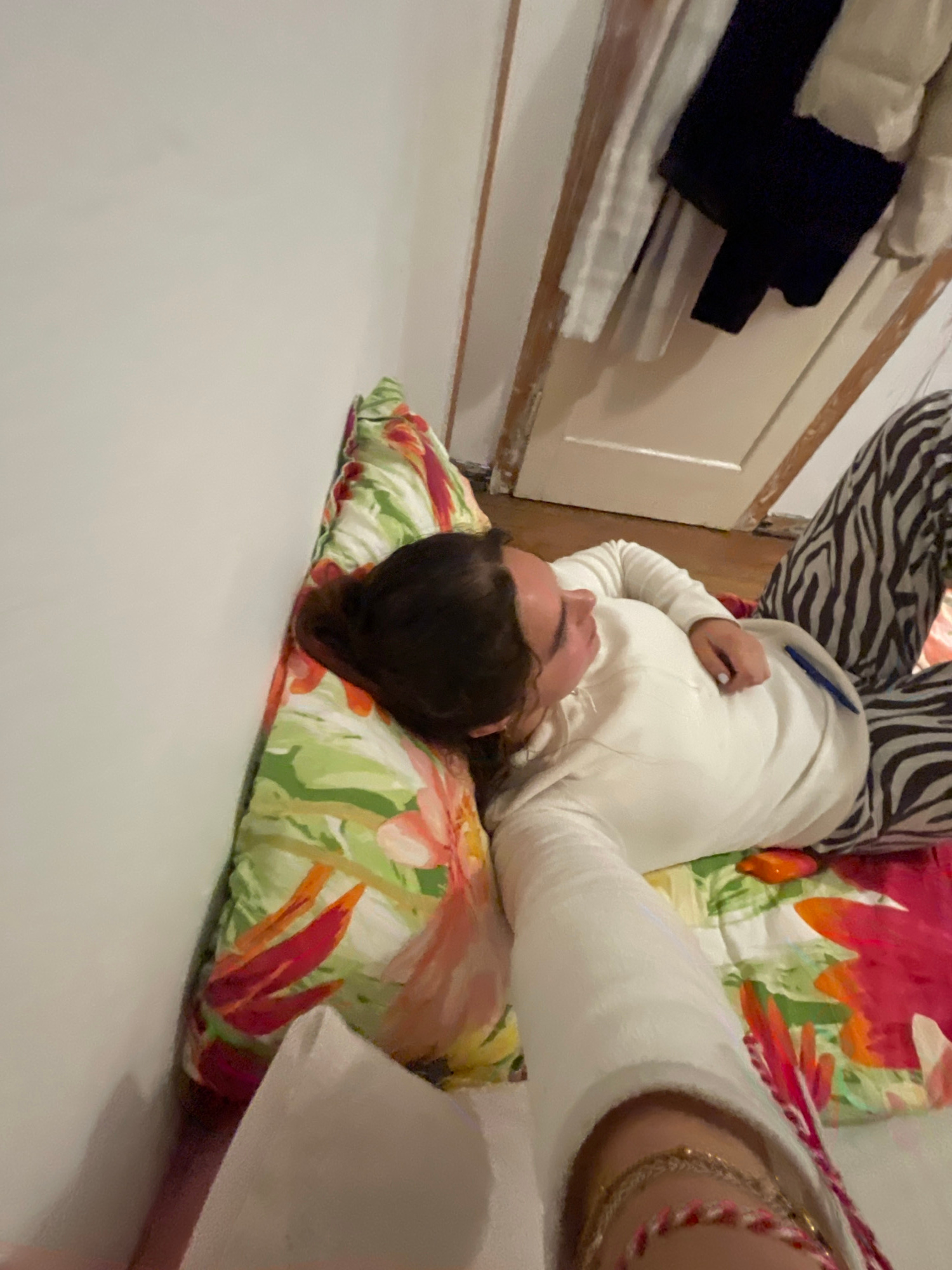 A person lies on a bed with a floral-patterned pillow in a room. The person wears a white sweatshirt and zebra-striped pants. Part of a closet or cabinet is visible on the left. The location is unknow…read more