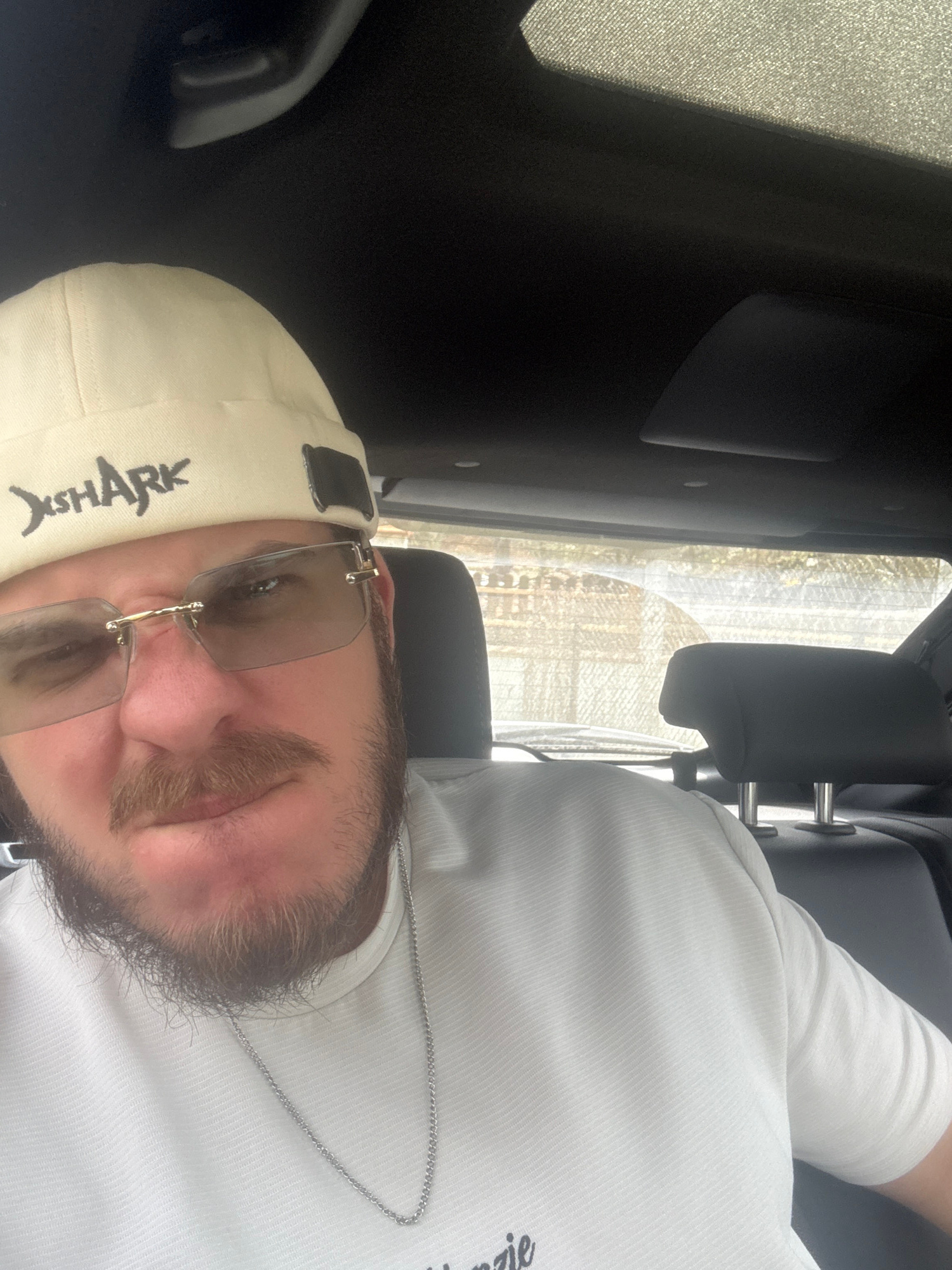 A person is inside a vehicle, possibly a car, as suggested by the interior including the dashboard, seat, and window. The person is wearing a white t-shirt, a light-colored baseball cap with text, andβ¦read more
