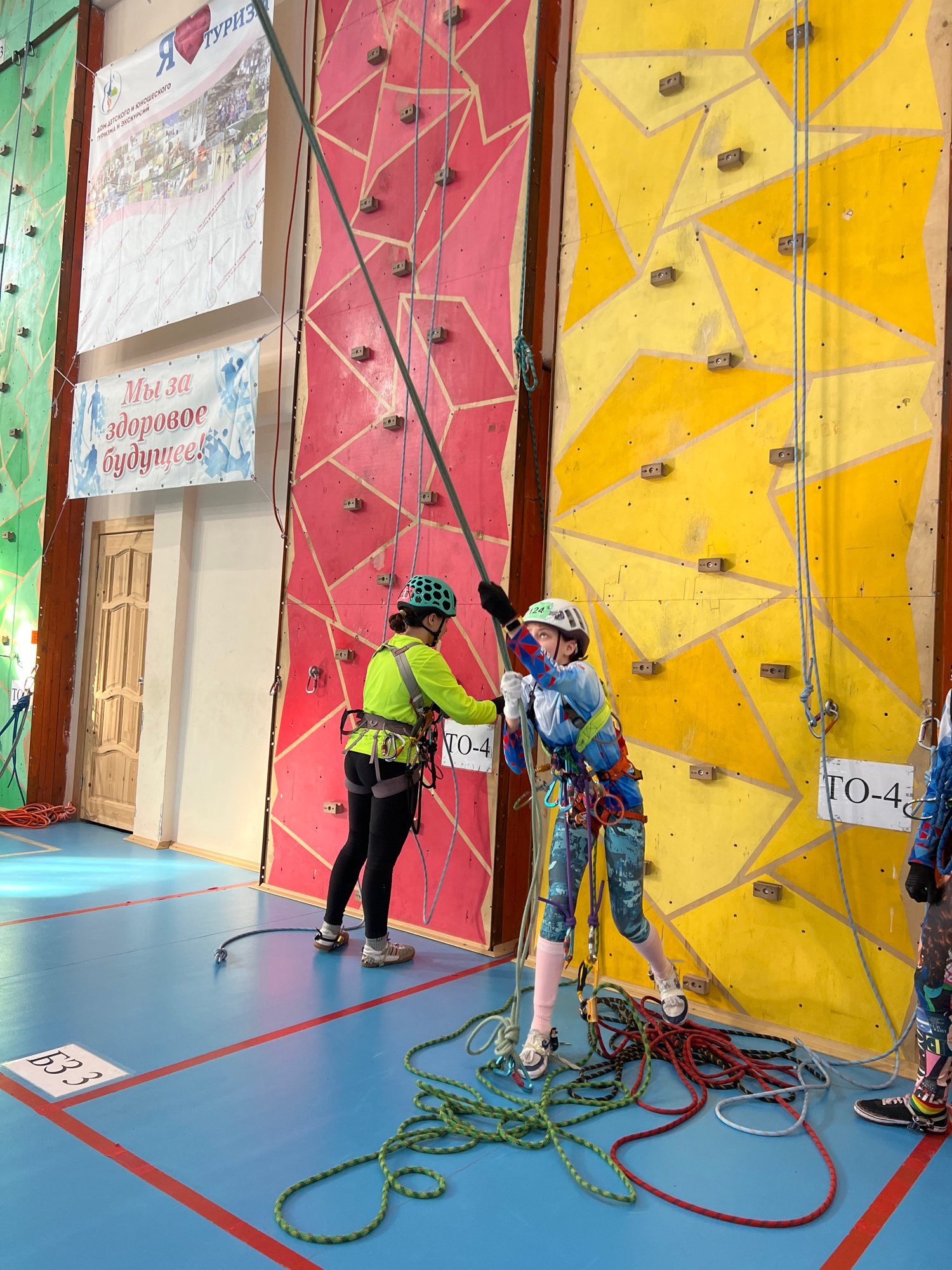 The image shows two people climbing a climbing wall in what appears to be a gymnasium or similar indoor space. The climbing wall is divided into sections of different colors (yellow, red, and green) w…read more