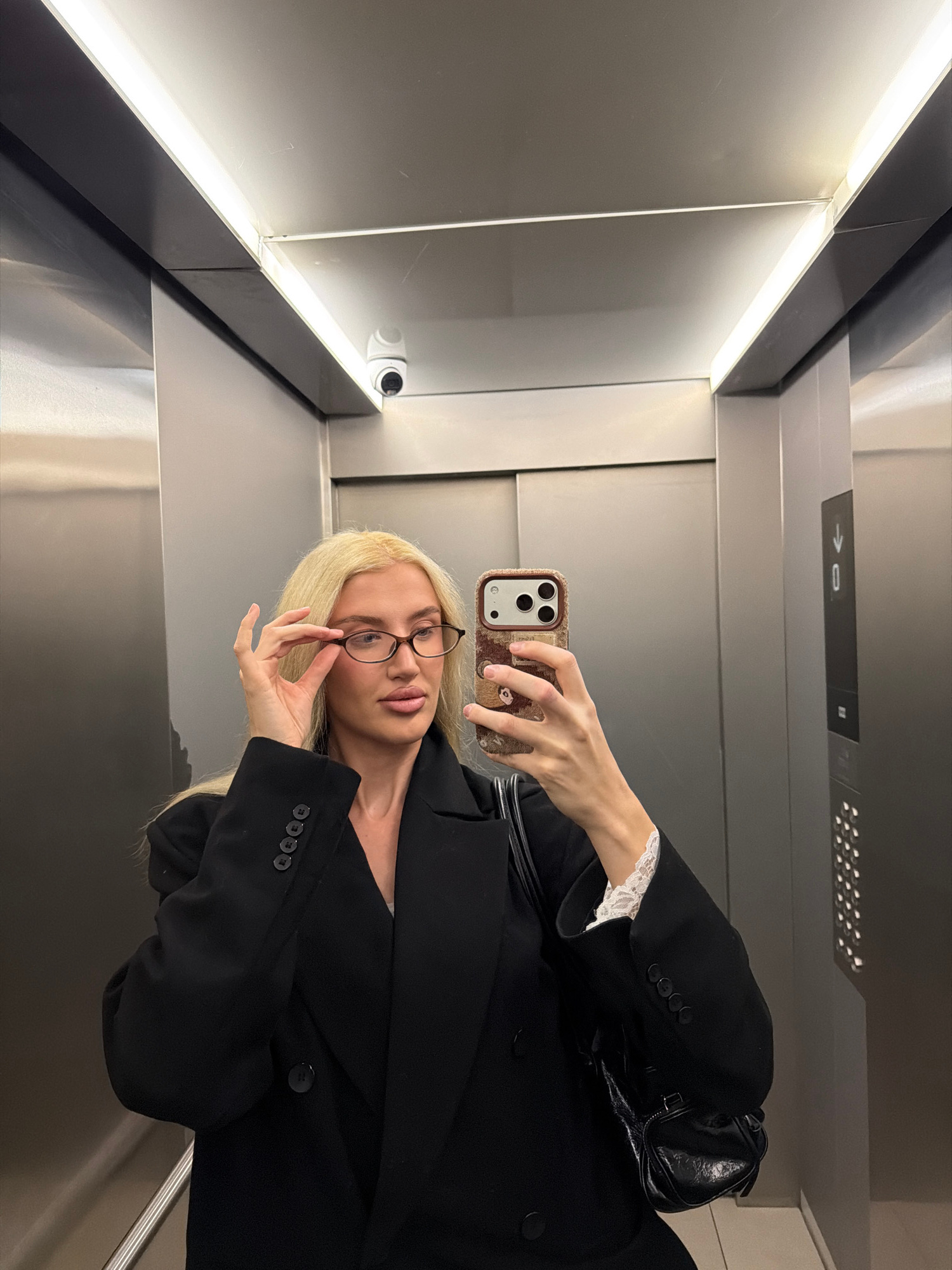 An indoor scene depicts a blonde female taking a mirror selfie inside an elevator, located in Belgrade, Serbia. The elevator cab features brushed metallic gray walls and ceiling, illuminated by linear…read more
