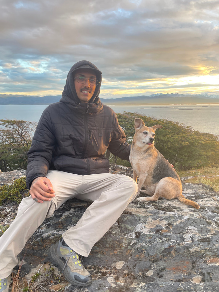 The image shows a man and a dog posing for a photo on a rocky hillside overlooking a body of water and distant mountains. The original image is rotated 90 degrees to the left, depicting the scene side…read more