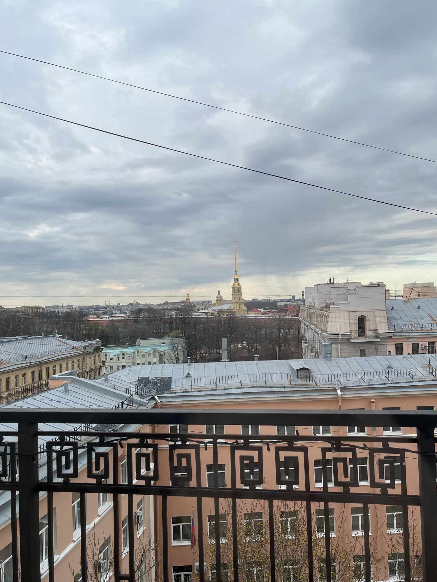 The image displays an urban cityscape viewed from a high vantage point, likely a balcony or window, under an overcast sky. In the foreground, a dark, ornate metal balcony railing with a repeating geom…read more