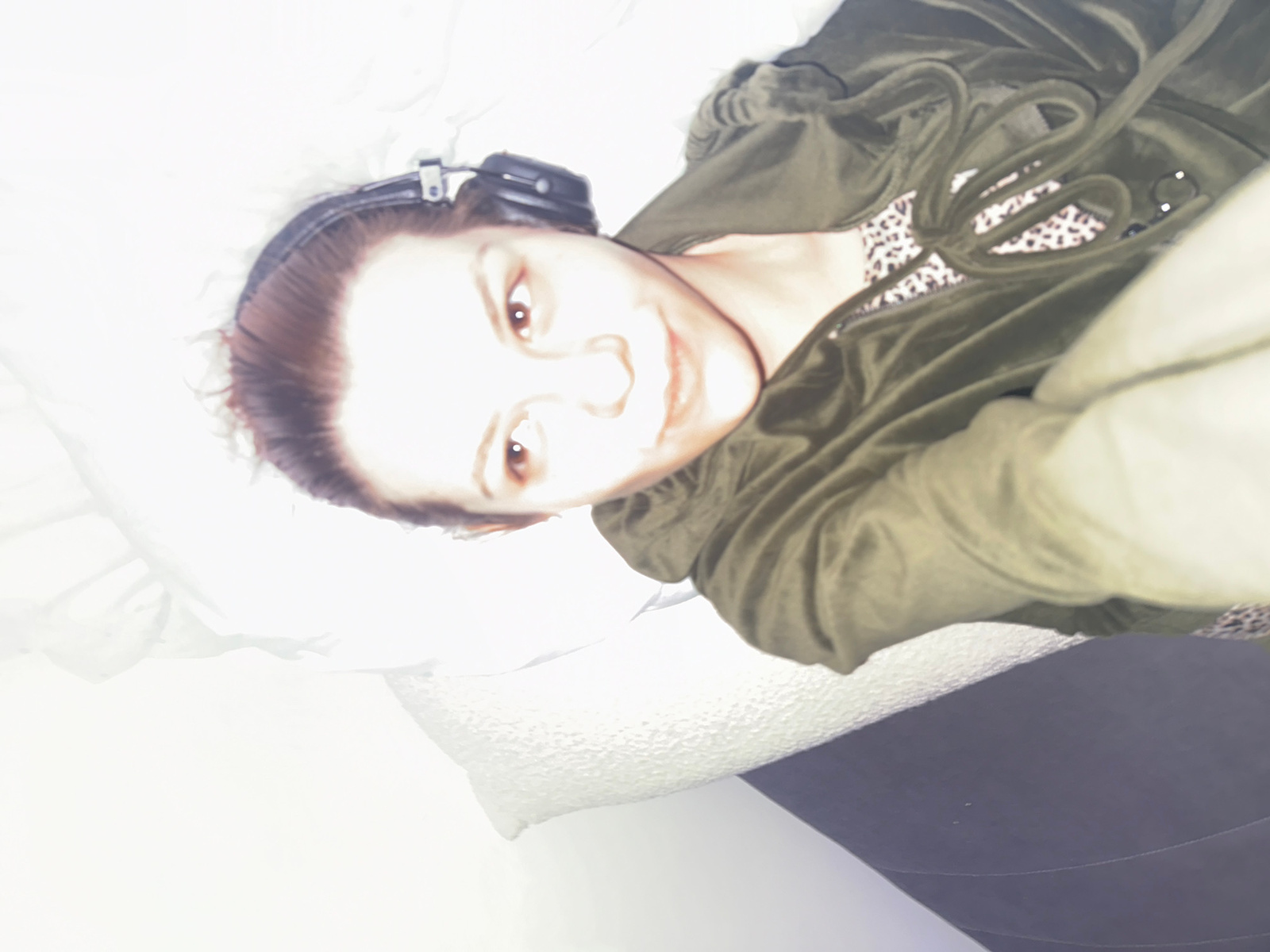 The media file presents a close-up indoor portrait of a young person, likely female, in a relaxed pose. The individual is positioned diagonally, resting their head on a white pillow or cushion. They h…read more