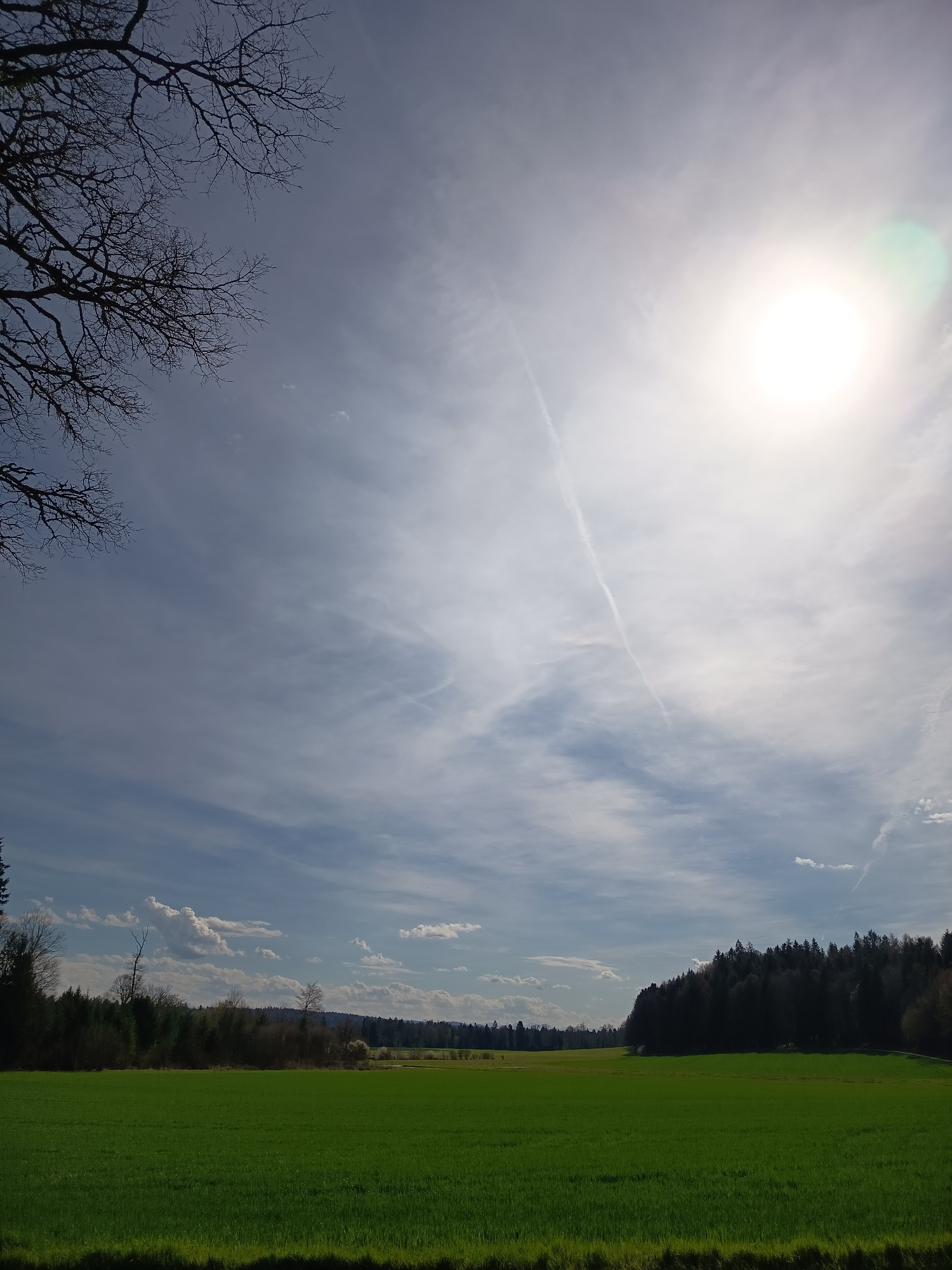 The image depicts a daytime scene in Neuendorf, Switzerland. A bright sun dominates the upper right portion of the sky, which is partially obscured by streaky cirrus clouds. A contrail extends from ne…read more