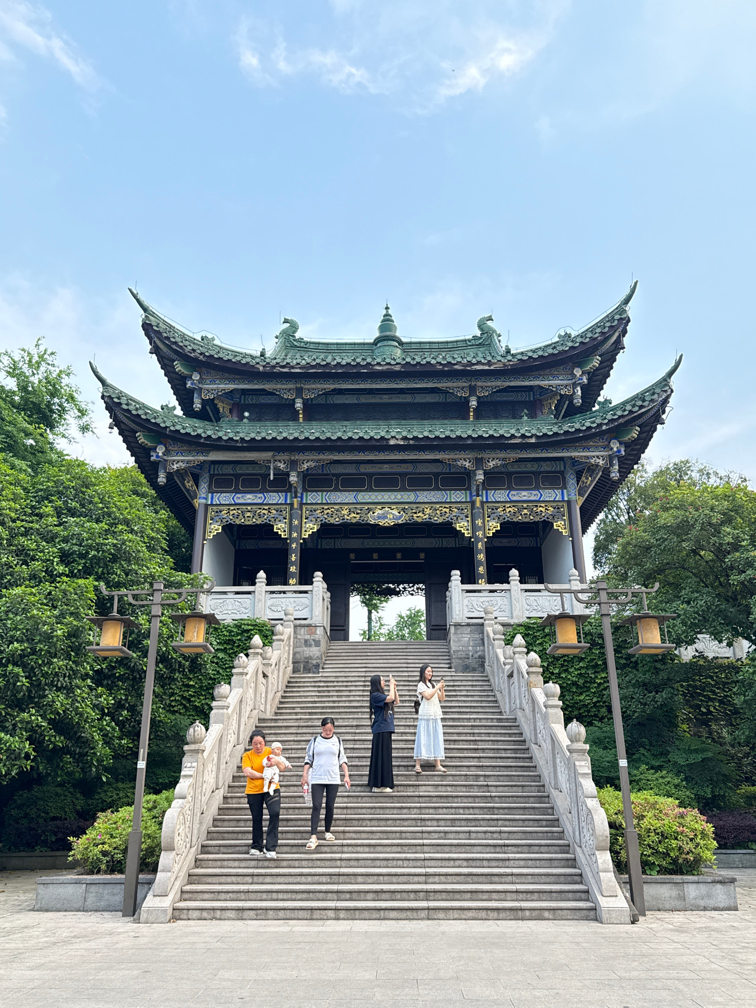 The image shows a multi-tiered traditional Chinese building, likely a temple or pavilion, in what appears to be a park-like setting in Liangjiang, China. The structure features ornate roofs with upwar…read more