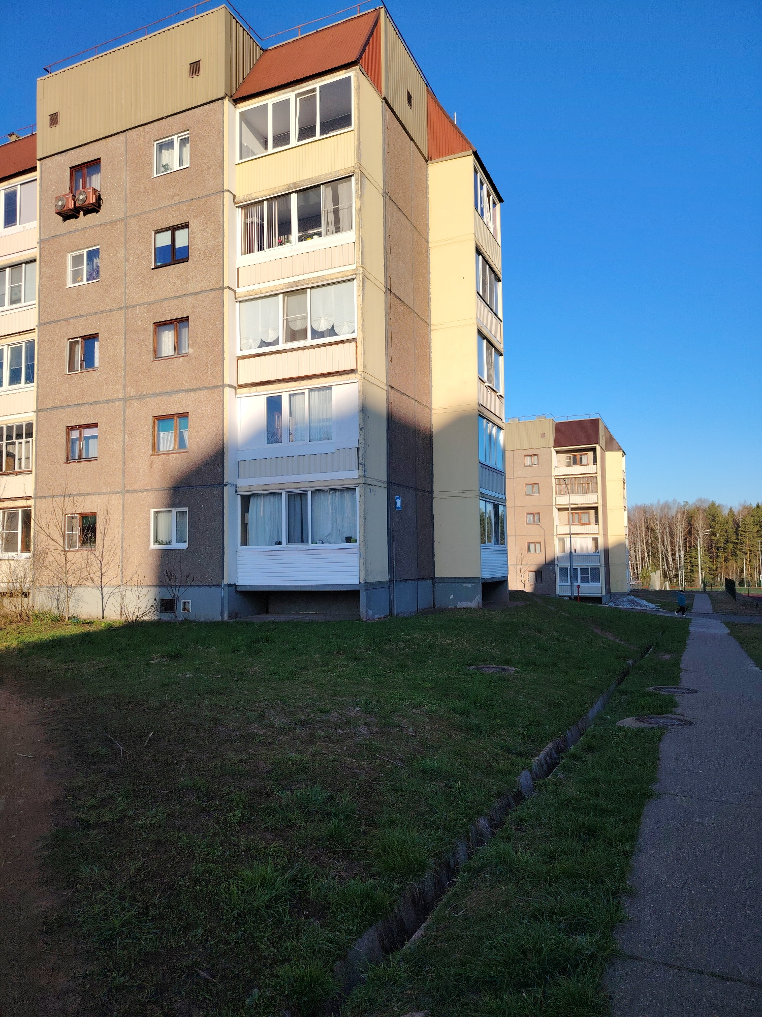 The image captures an outdoor scene in Марковский, Russia, featuring residential buildings and a surrounding environment under a clear blue sky. In the foreground and mid-ground, two multi-story apar…read more