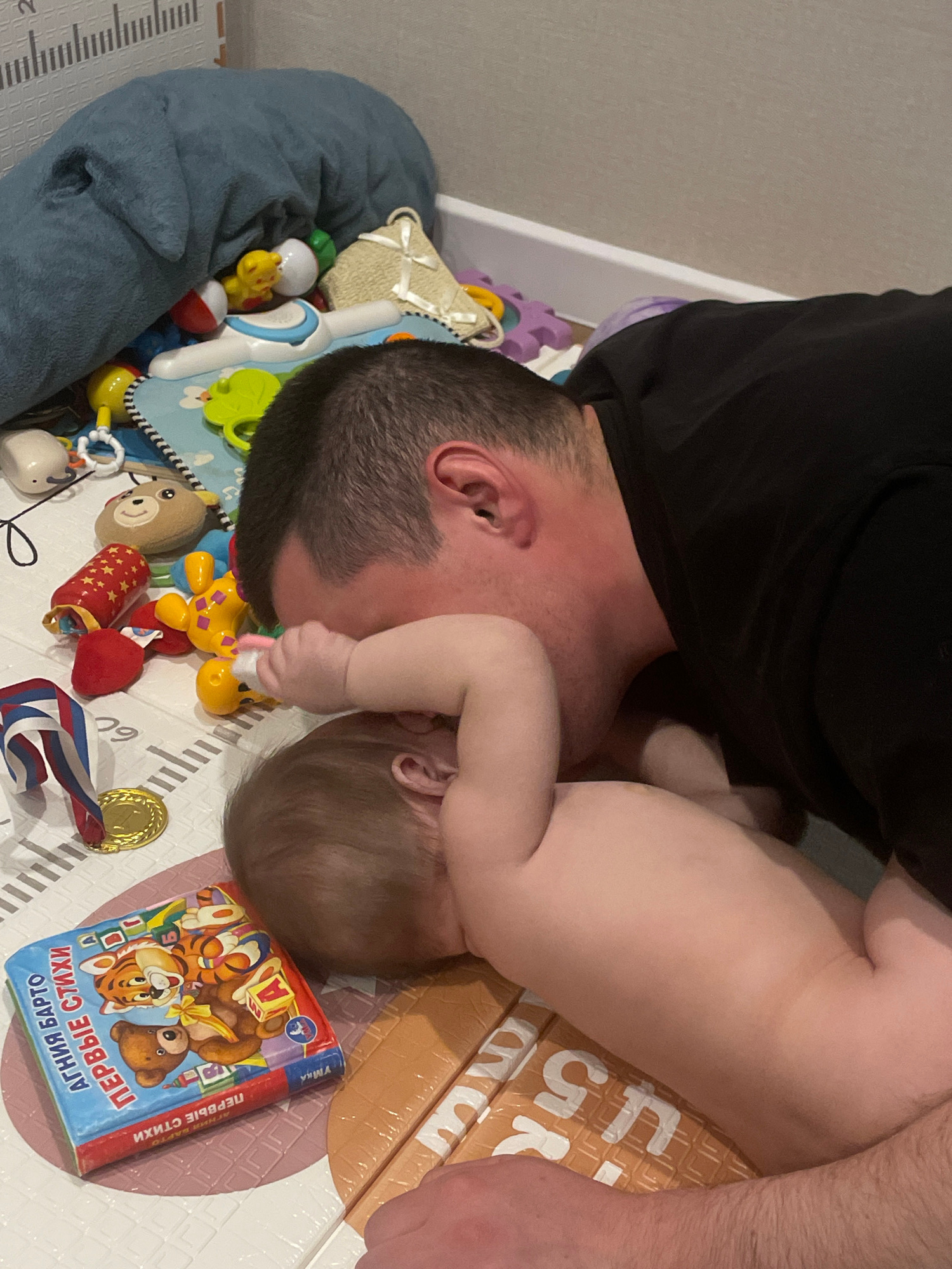 A man and a baby are lying on a play mat surrounded by toys. The man is wearing a black shirt. The baby is naked. A children's book titled "Первые стихи" is visible in the lower right corner. The scen…read more