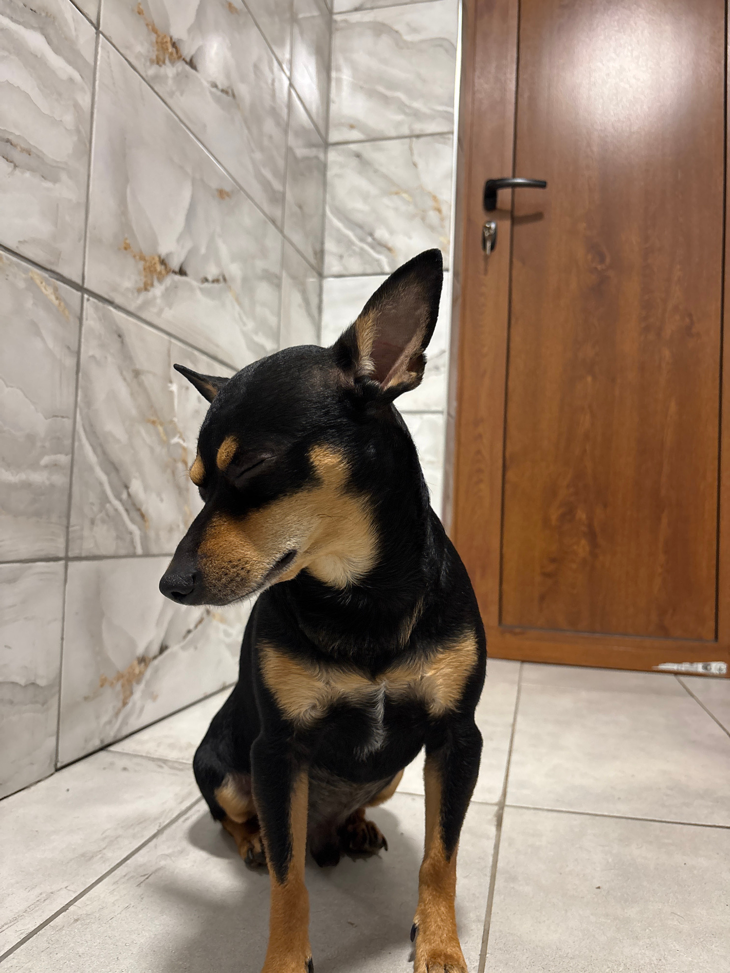 A dog with black and tan markings is lying on a tiled floor. The tiles are white with a grey and gold marbling pattern. In the background, a wooden cabinet with a dark handle is visible. The location…read more