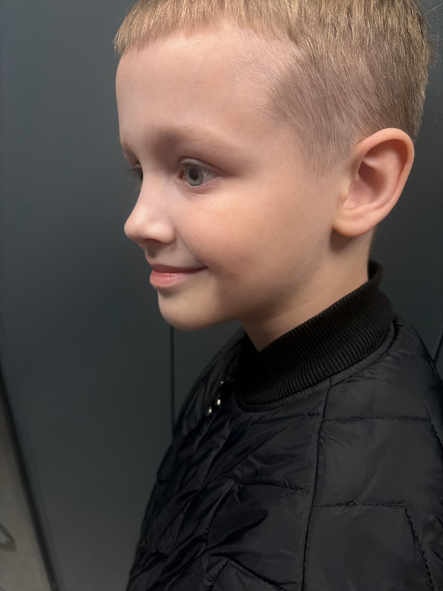 A close-up, side-profile shot depicts a young boy with fair skin and short, blonde hair, wearing a black quilted jacket with a ribbed collar. He appears to be looking downwards. The background is a so…read more