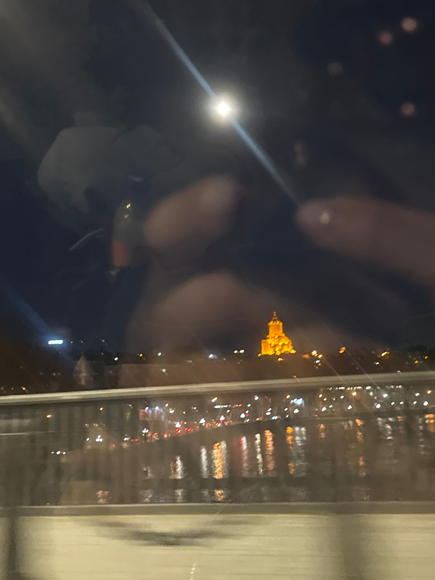 The image captures a nighttime cityscape viewed through a window, significantly influenced by reflections from the interior. The primary orientation appears to be landscape, though the provided image…read more
