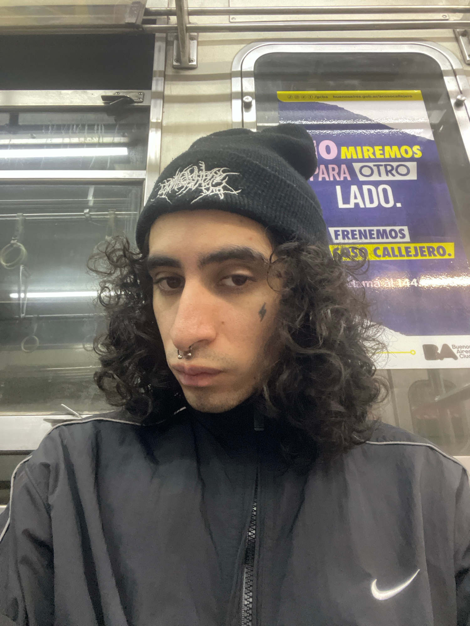 A medium shot depicts a person with dark curly hair, a beanie with indiscernible white text, and a black jacket with a white Nike logo. The person has a teardrop tattoo under their eye and a pierced s…read more