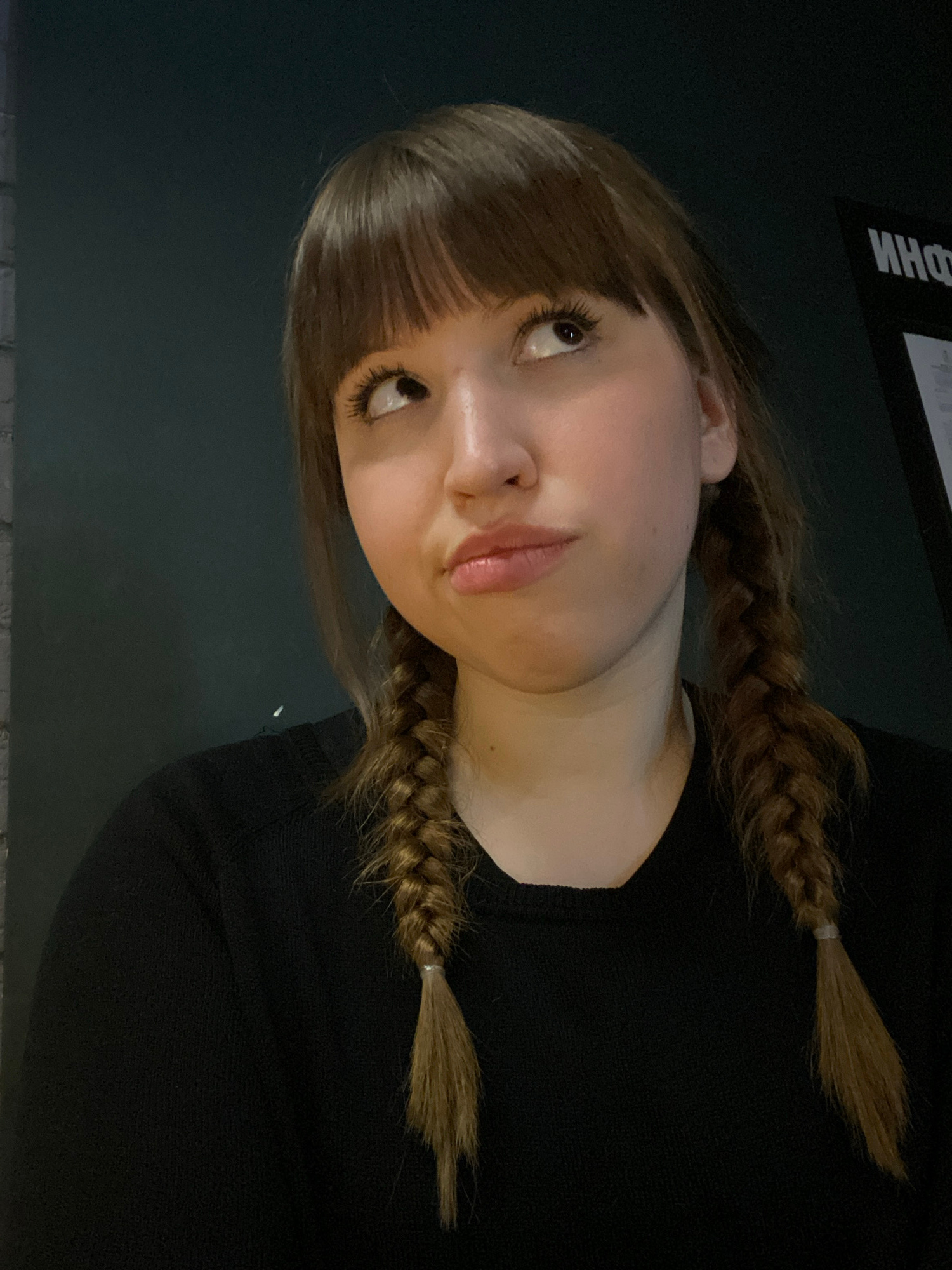 The image is a portrait of a young woman, rotated 90 degrees counter-clockwise. She has light brown hair, featuring bangs across her forehead and two distinct braids on either side, each secured with…read more