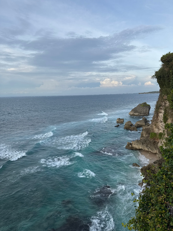 This image presents an elevated view of a coastal environment in Uluwatu, Indonesia. The scene is dominated by the ocean, displaying varying shades of deep blue and turquoise water, with multiple paraβ¦read more
