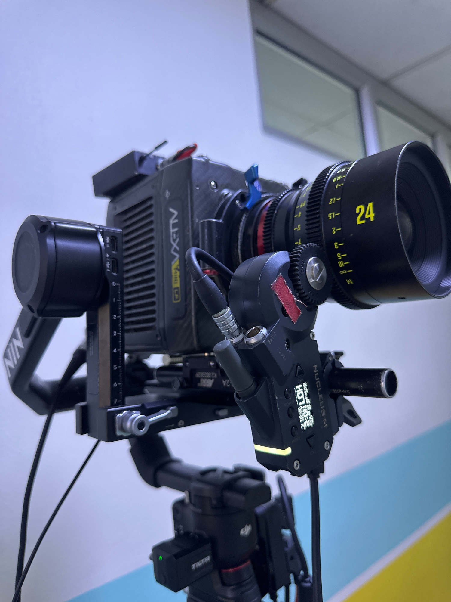 The image shows a professional film camera, specifically an ARRI Alexa Mini LF, mounted on a gimbal, possibly a DJI Ronin. The camera has a 24mm lens attached. A Nucleus-M focus control system is conn…read more