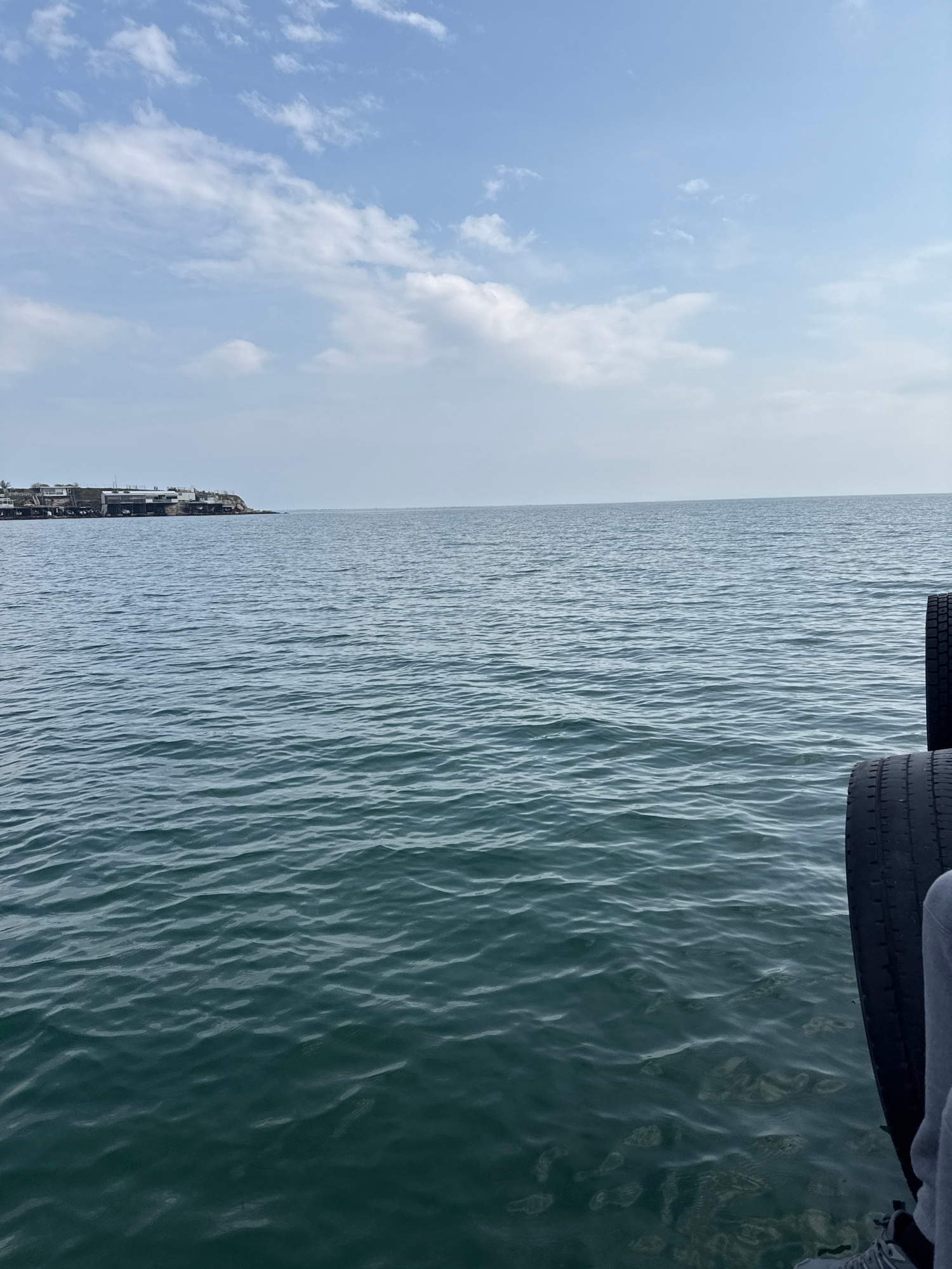 A view from a structure, potentially a pier or boat, overlooks the Black Sea near Ravda, Bulgaria. The water is a slightly choppy gray-blue, indicative of some wind or current. In the top right, parts…read more