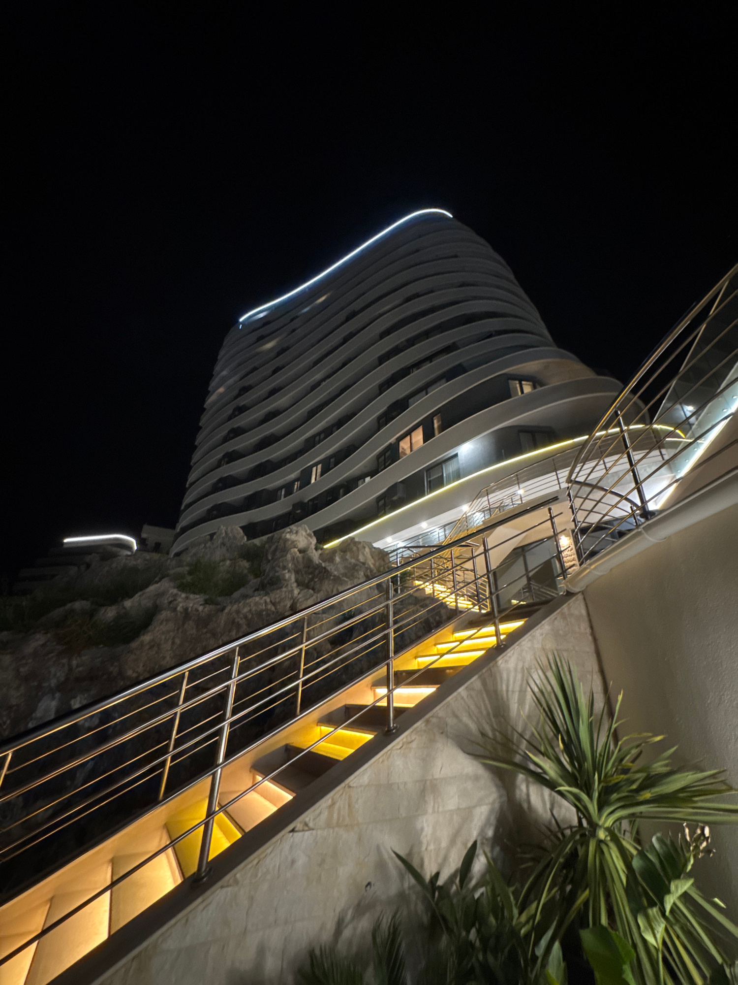 An angled, nighttime outdoor shot focuses on a modern building seemingly built into a rock face. The architecture is notable for its curving, horizontal, light-colored balconies, contrasting against a…read more