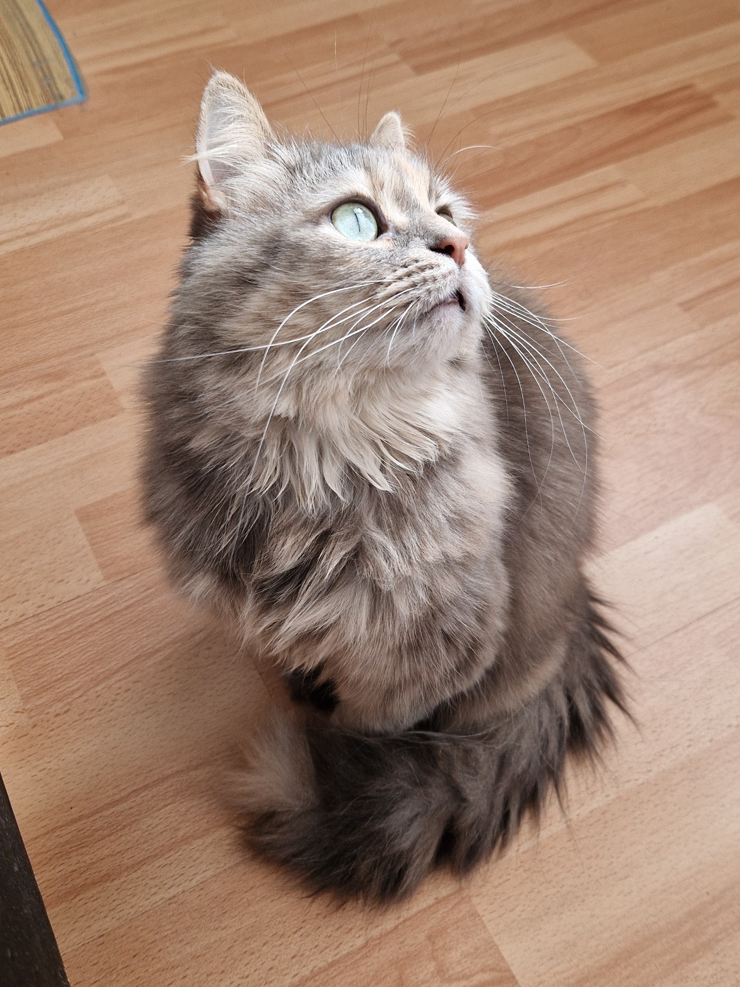 The image shows a long-haired cat lying on a wooden floor. The cat is mostly gray with patches of white and has green eyes. It is looking upwards. The floor appears to be made of light-colored wood pl…read more