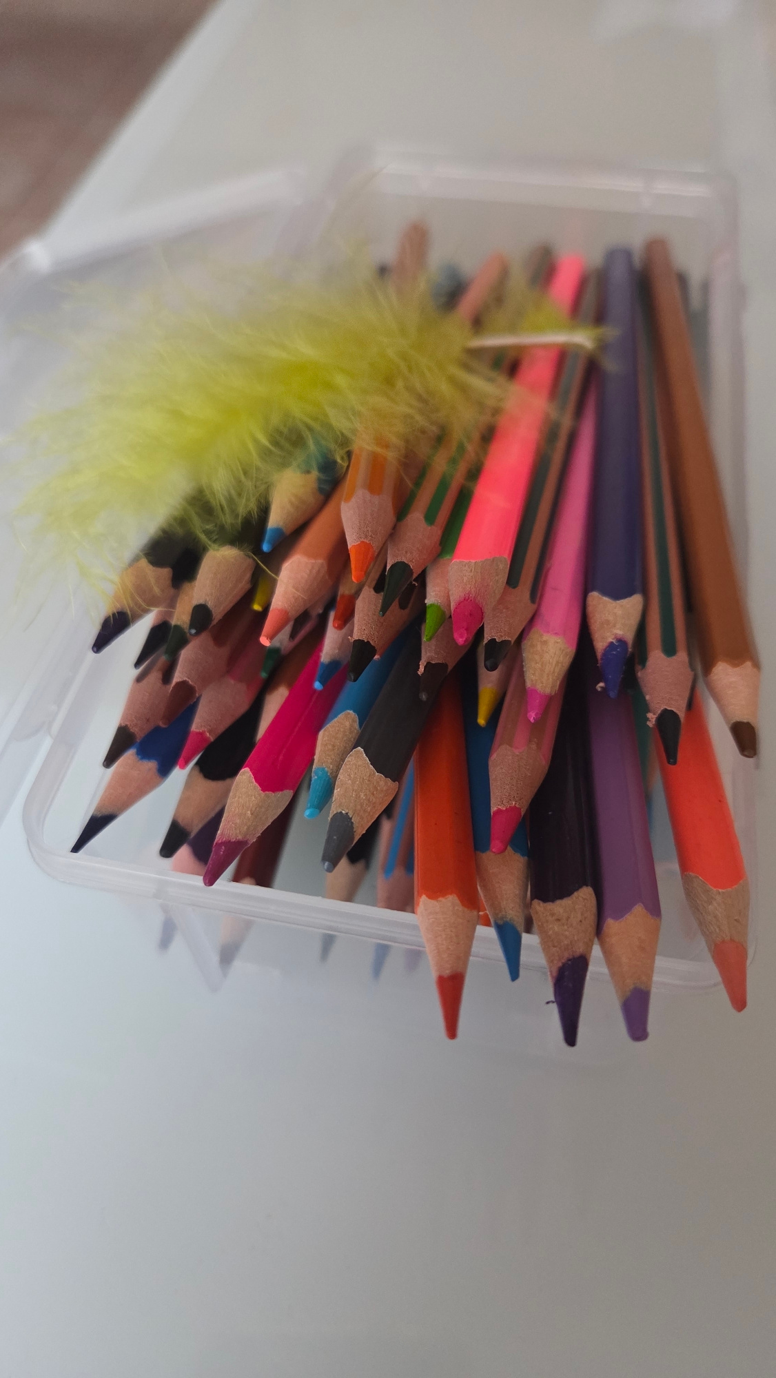 A clear, rectangular plastic container is filled with a dense collection of sharpened colored pencils, photographed from a slightly elevated and angled perspective. The pencils are arranged with their…read more