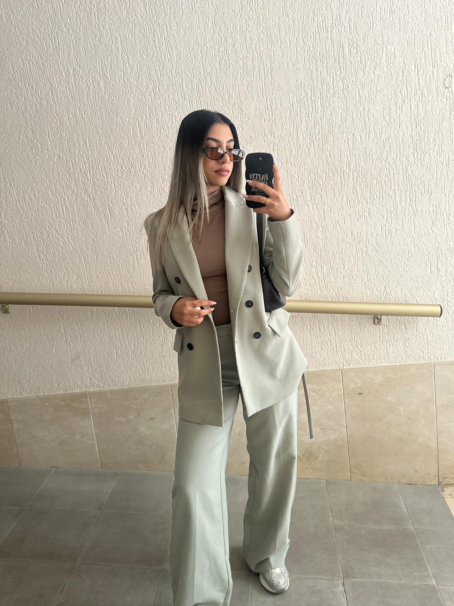 A woman stands in front of a beige wall and tile structure, likely an interior space, holding a black smartphone with white lettering in her left hand. She is wearing a light green pantsuit over a neu…read more