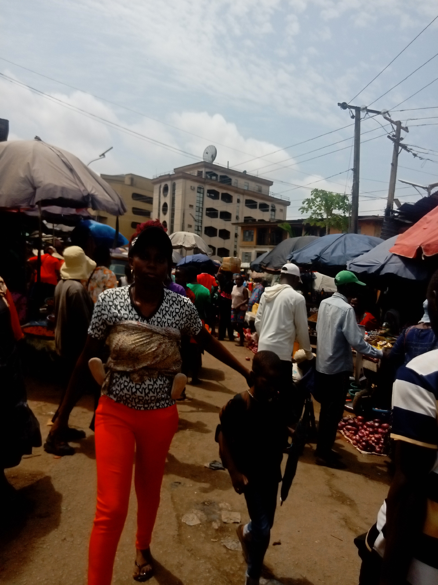 The photograph shows a bustling street scene in Onitsha, Nigeria, populated with people and vendors. A woman in a black-and-white patterned shirt and bright orange pants is carrying a child on her bac…read more