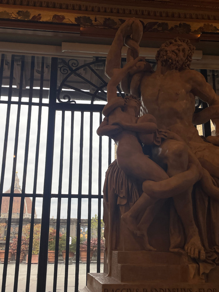 The image displays a large, light-toned marble or terracotta sculpture identified as Baccio Bandinelli's "Laocoön Group." The sculpture features a muscular, bearded male figure centrally, engaged in s…read more