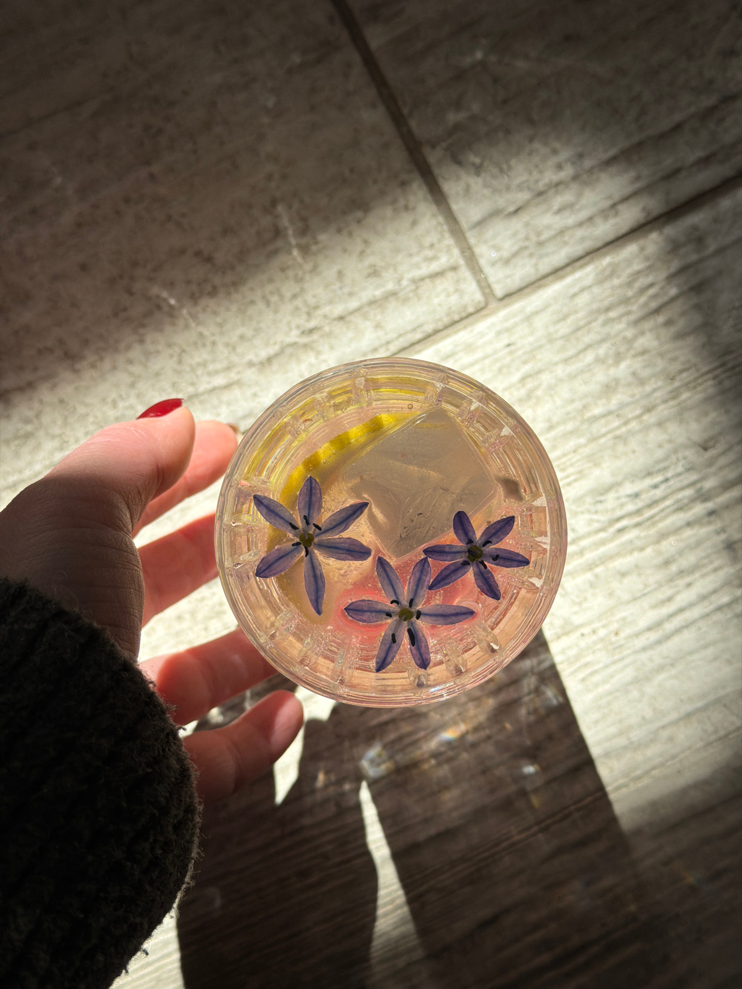 A high-angle, indoor shot depicts a hand holding a glass of an iced cocktail. The glass sits atop a beige, marbled surface illuminated by sunlight streaking in from the upper left. The cocktail contai…read more