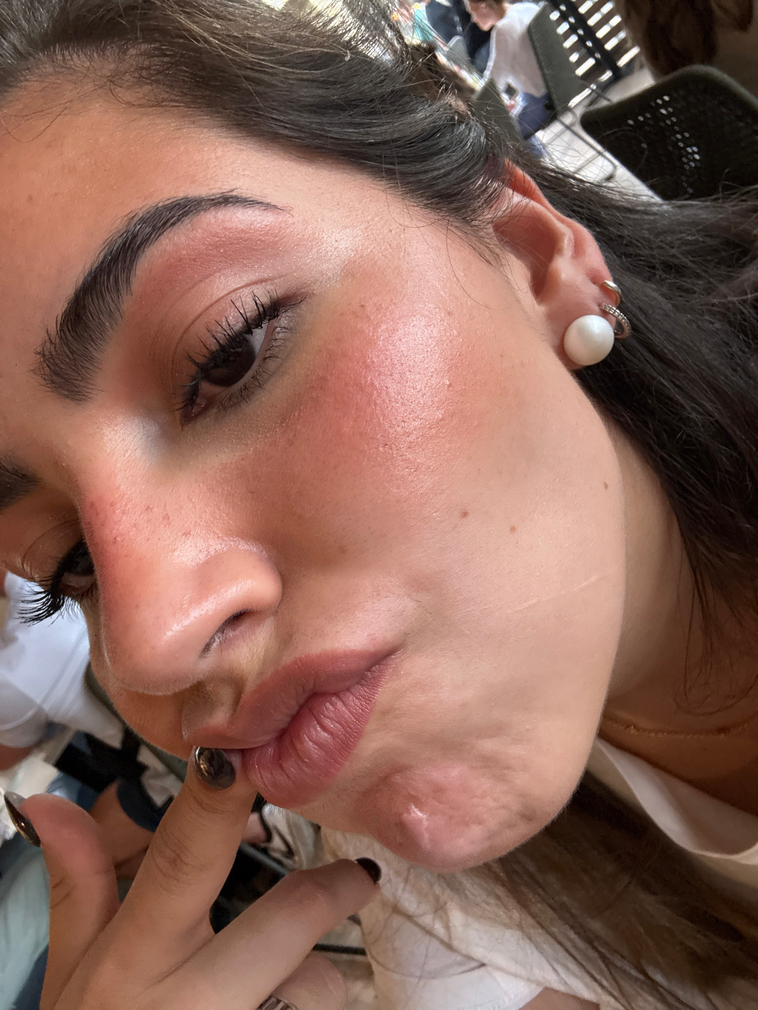 A close-up, low-angle shot depicts a woman with dark hair, fair skin, and prominent facial features, likely in an outdoor setting. She has a pearl earring in her left ear, defined eyebrows, and visibl…read more