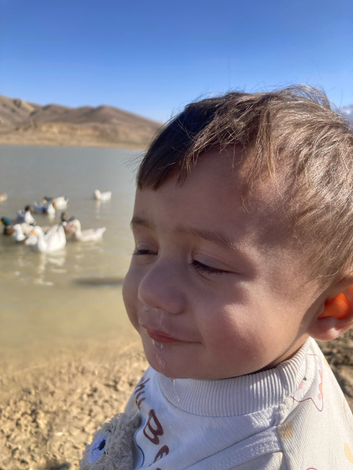 This image depicts an outdoor scene at Hanna Lake, near Quetta, Pakistan. A young child with light brown hair is positioned in the right foreground, seen in profile with closed eyes and a slight smile…read more