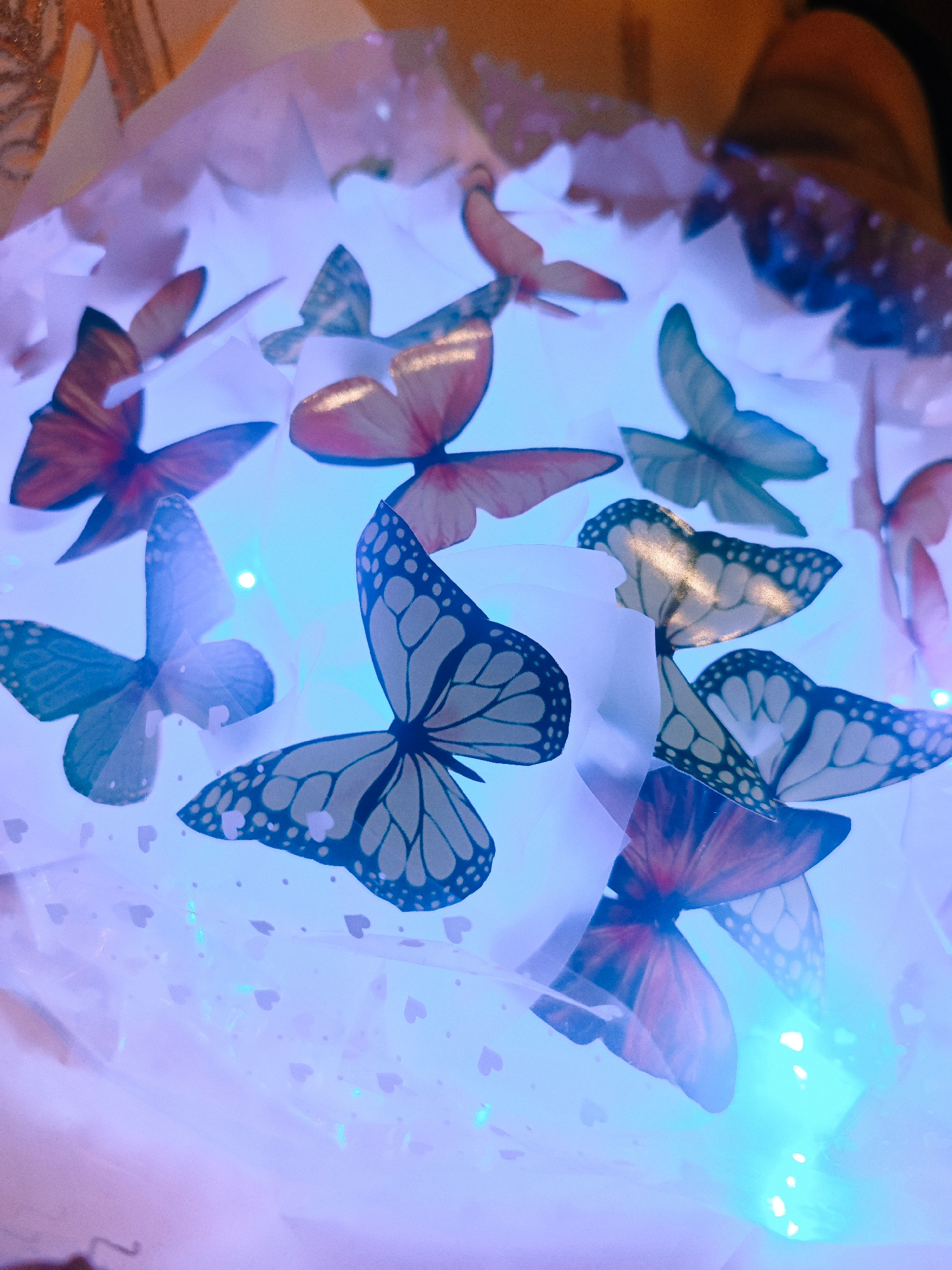 A close-up shot reveals a collection of artificial butterflies illuminated with blue light, possibly part of a decorative arrangement or display. The butterflies exhibit various colors and patterns, s…read more