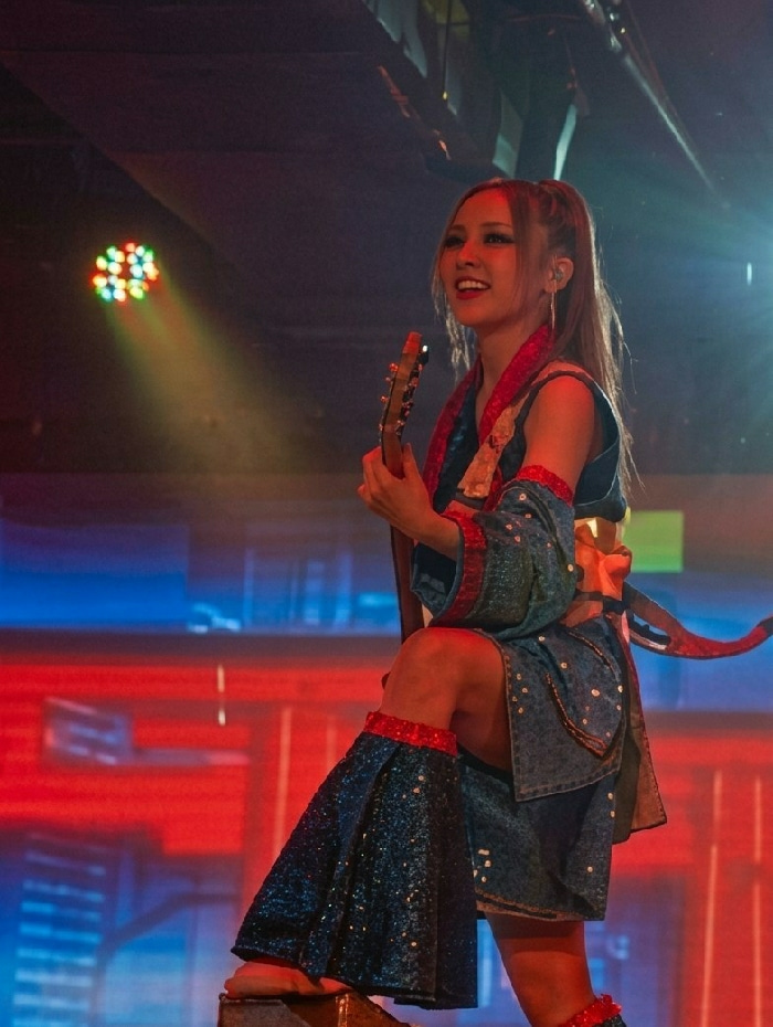 The image captures a female performer on a stage located in Shinjuku, Japan. The individual, appearing to be of East Asian descent, is positioned with her left knee bent and her foot elevated on an un…read more