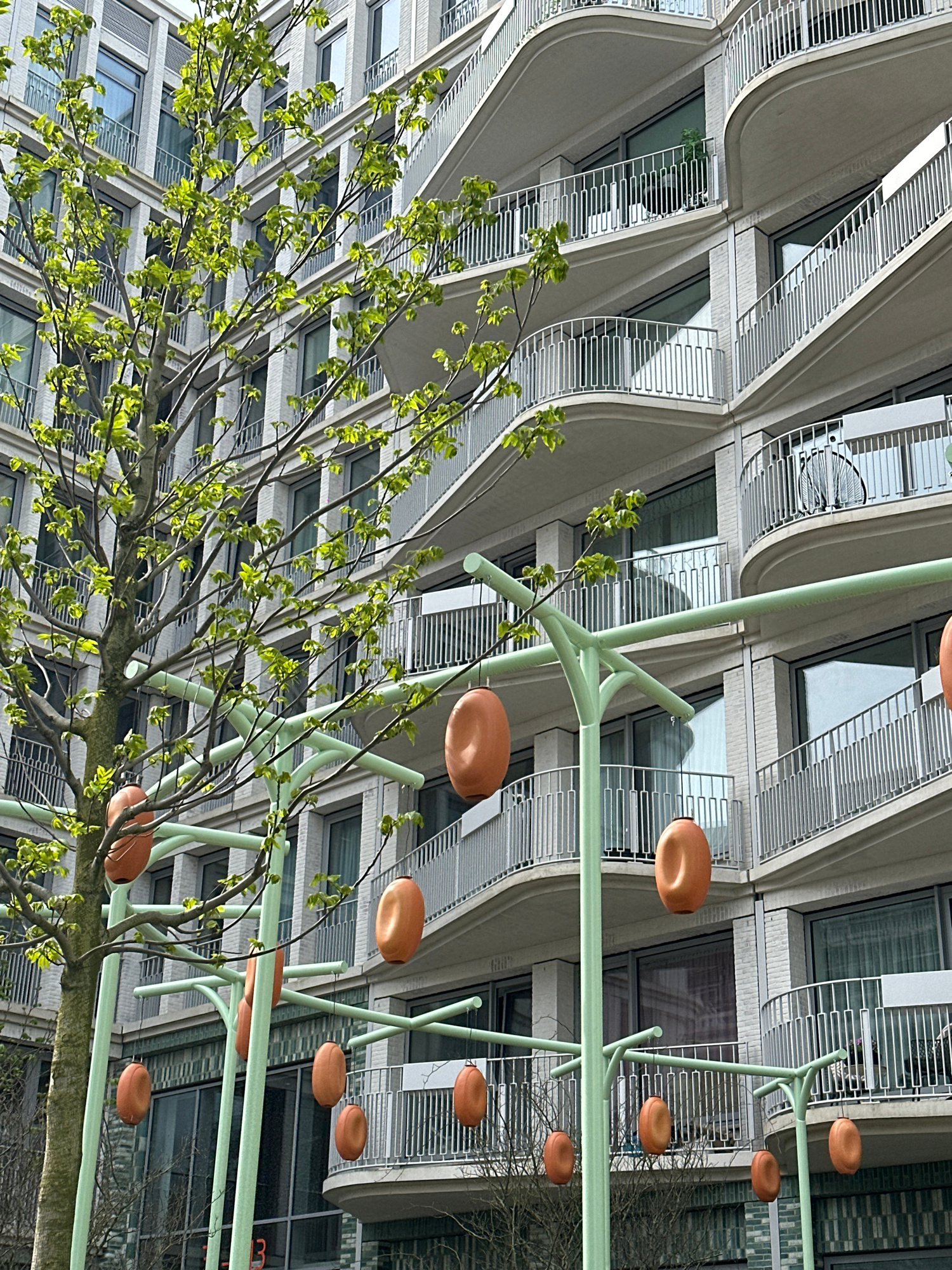 The image presents a view looking upwards towards a modern architectural structure, most likely an apartment building, with a unique design featuring curved balconies. The facade is predominantly gray…read more